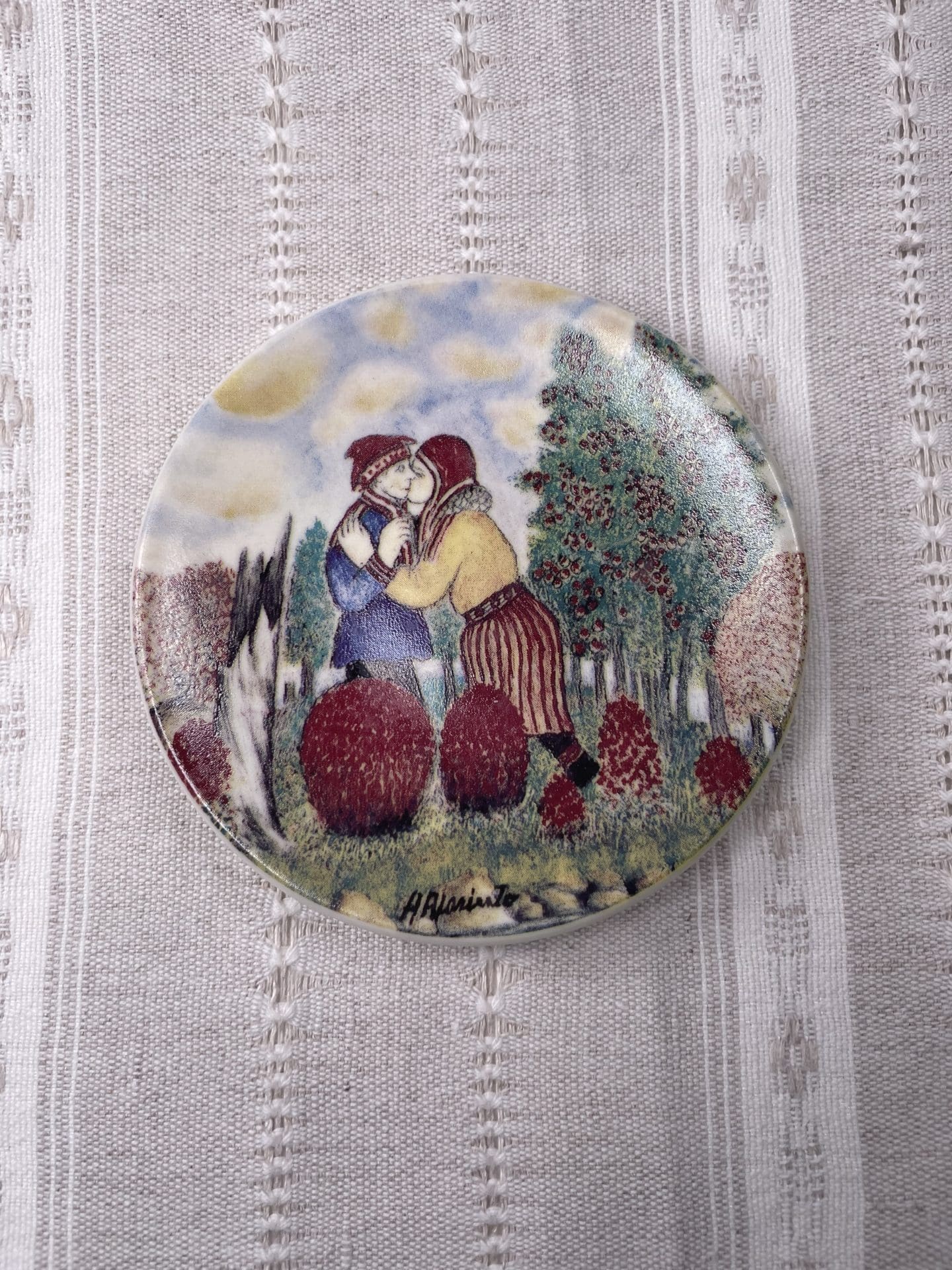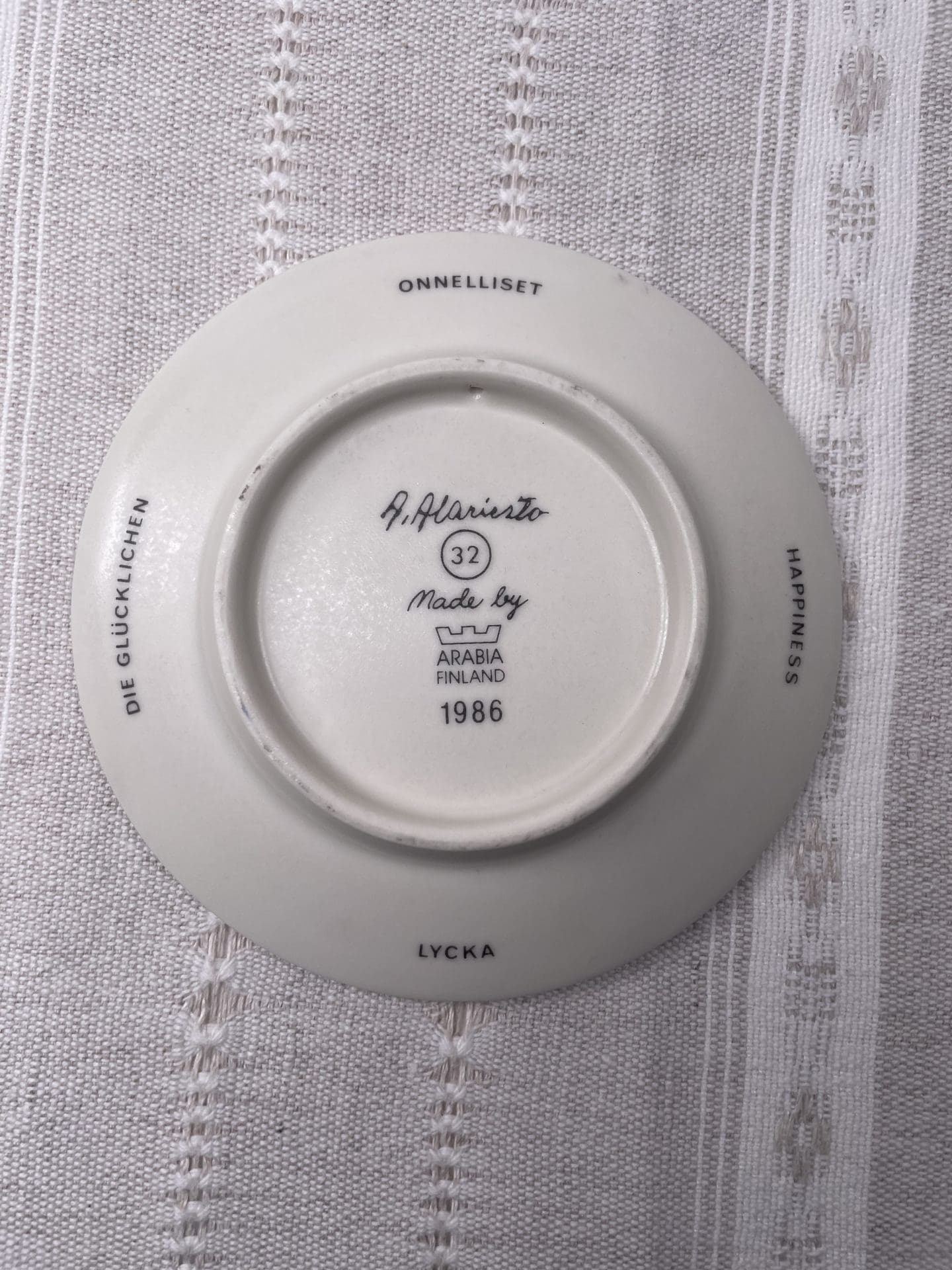 Andreas Alariesto wallplate number 32 Happiness. In good condition. 12cm in diameter.