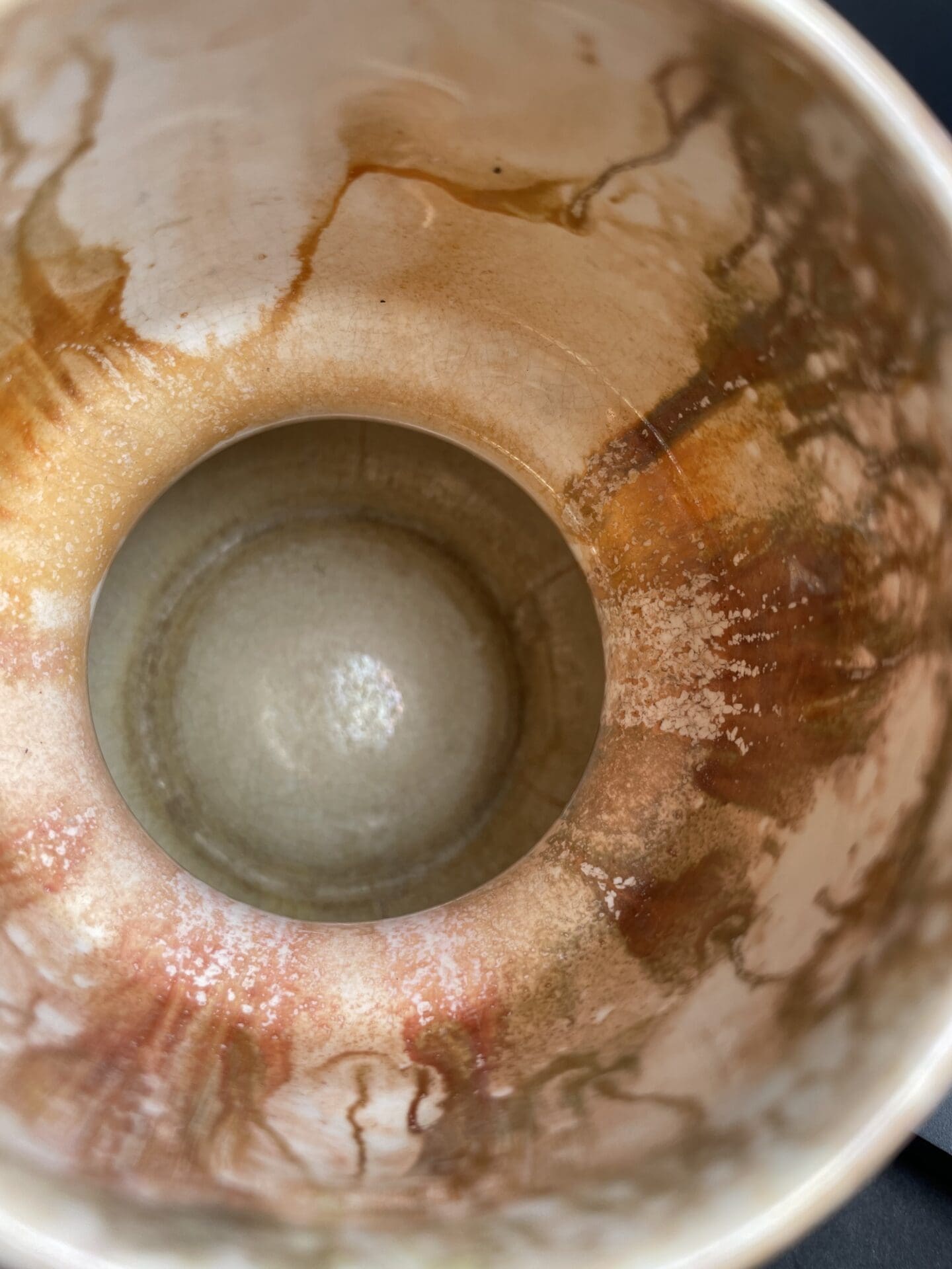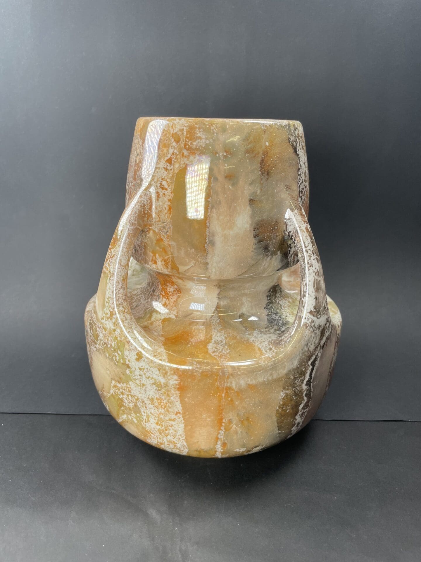 Arabia 20cm art deco vase model AH0. Metal oxide stencil decoration. First time introduced in the Paris World Fair in 1900. Good condition, some cracking on the glaze. The stamp dates the vase during 1917-1927. The method was developed by Arabia manager Gustav Herliz and Thure Öberg.