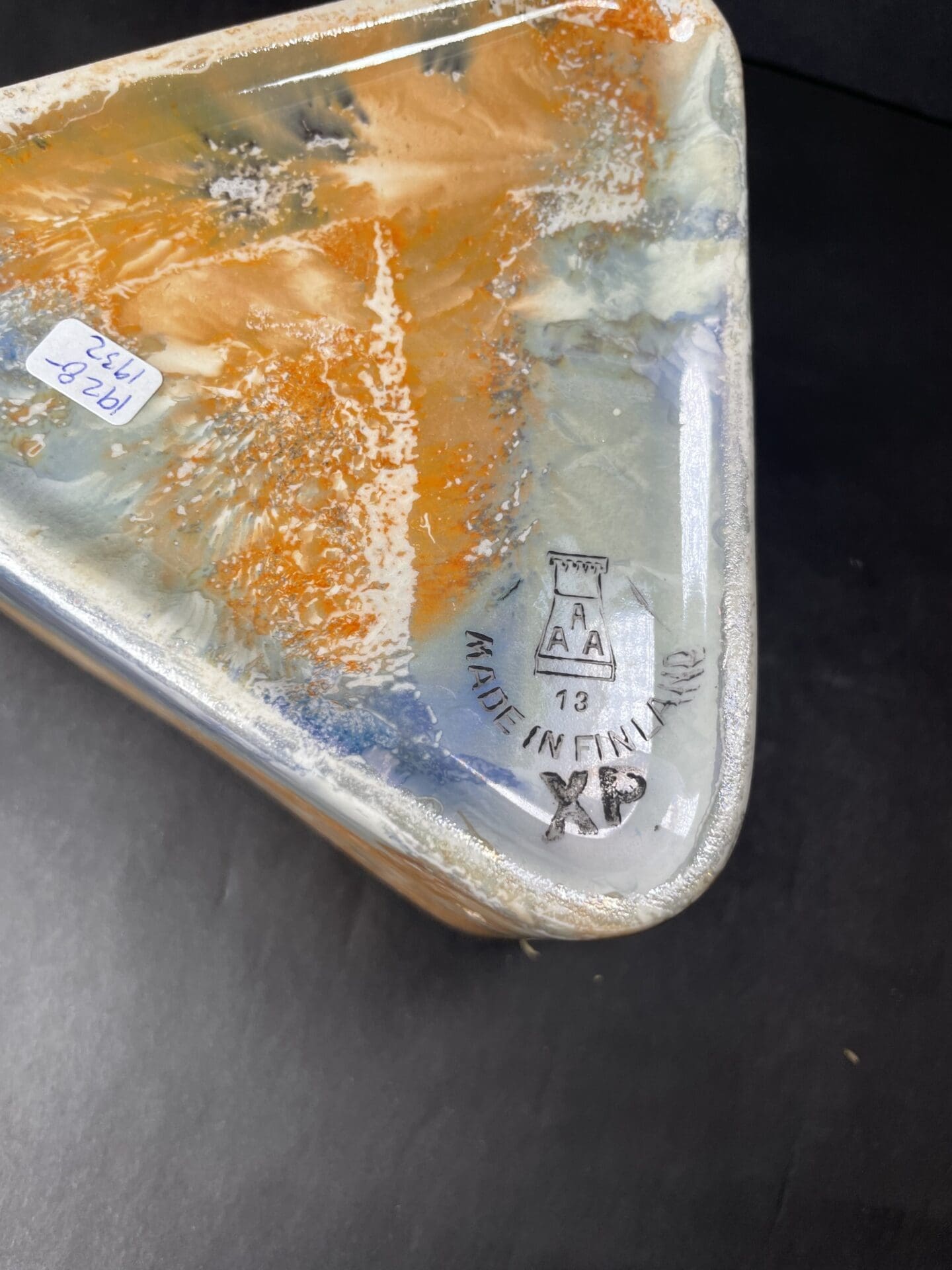 Arabia Art Deco Ash tray 12,5cm. Good condition. Made during 1928-32. Metal oxide stencil decoration. First time introduced in the Paris World Fair in 1900. Good condition, some cracking on the glaze. The method was developed by Arabia manager Gustav Herliz and Thure Öberg.