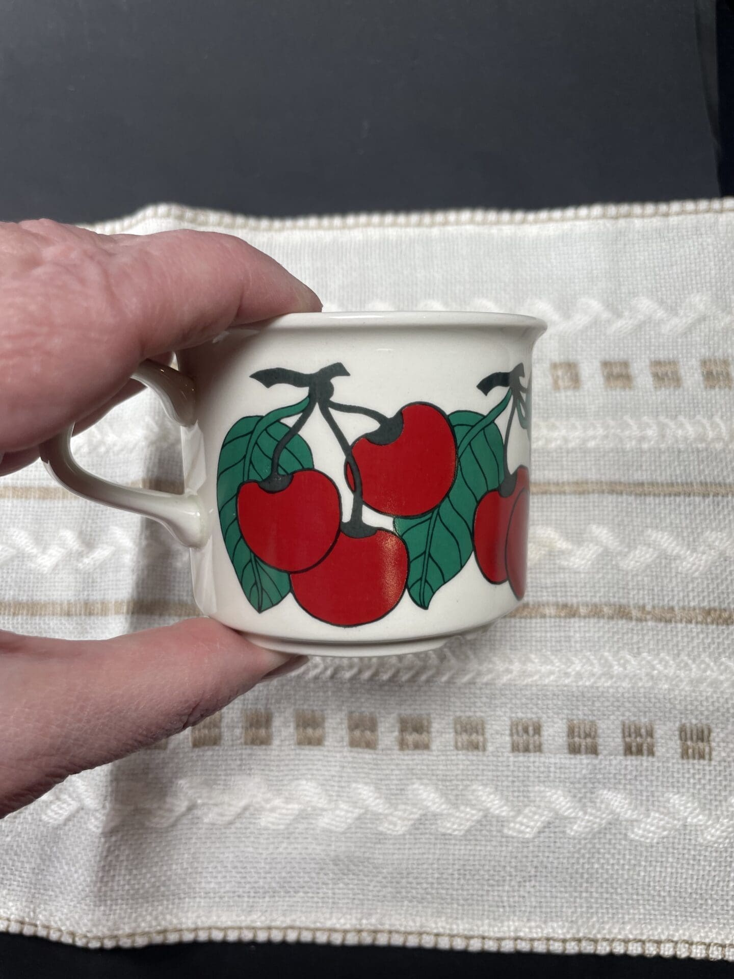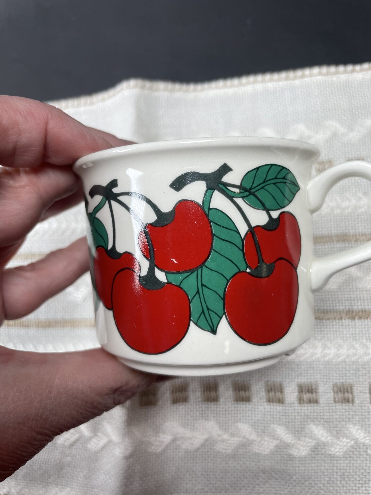 Arabia Kirsikka Coffee Cup. Designed by Inkeri Seppälä. Model EH was in production 1975-79. Good condition and bright colours, very little wear in the pattern. See photos for details. Cup 6cm high and 6cm in diameter. Plate 13cm in diameter.