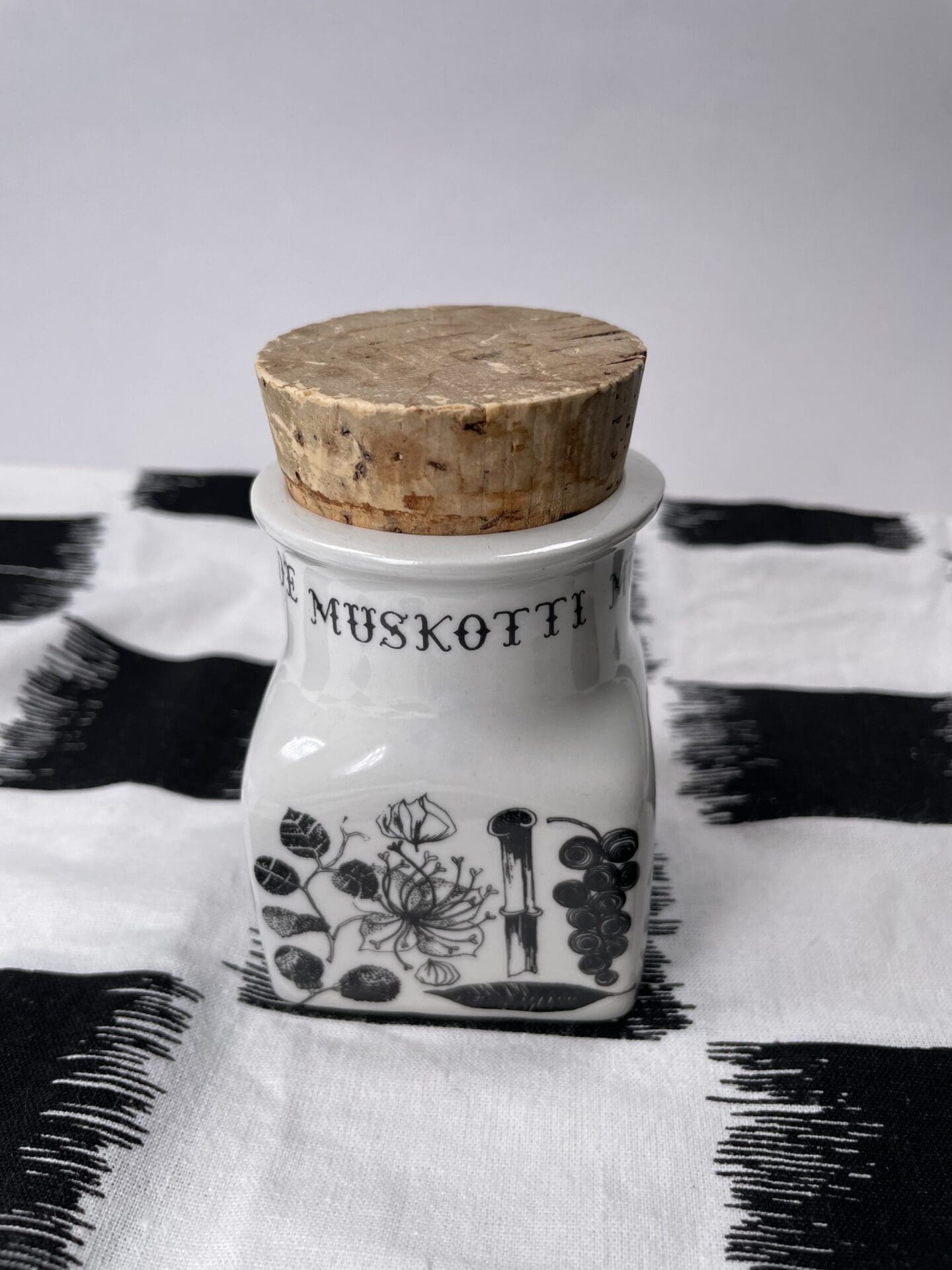 Arabia Spice Jar Nutmeg 7,7cm without the lid. Esteri Tomula pattern, shape by Ulla Procope. Good condition.