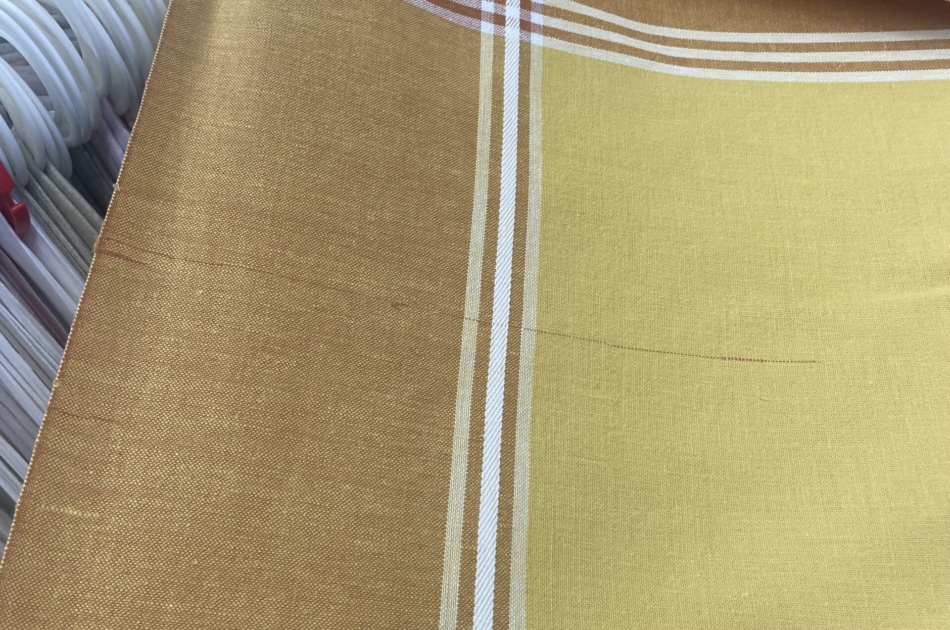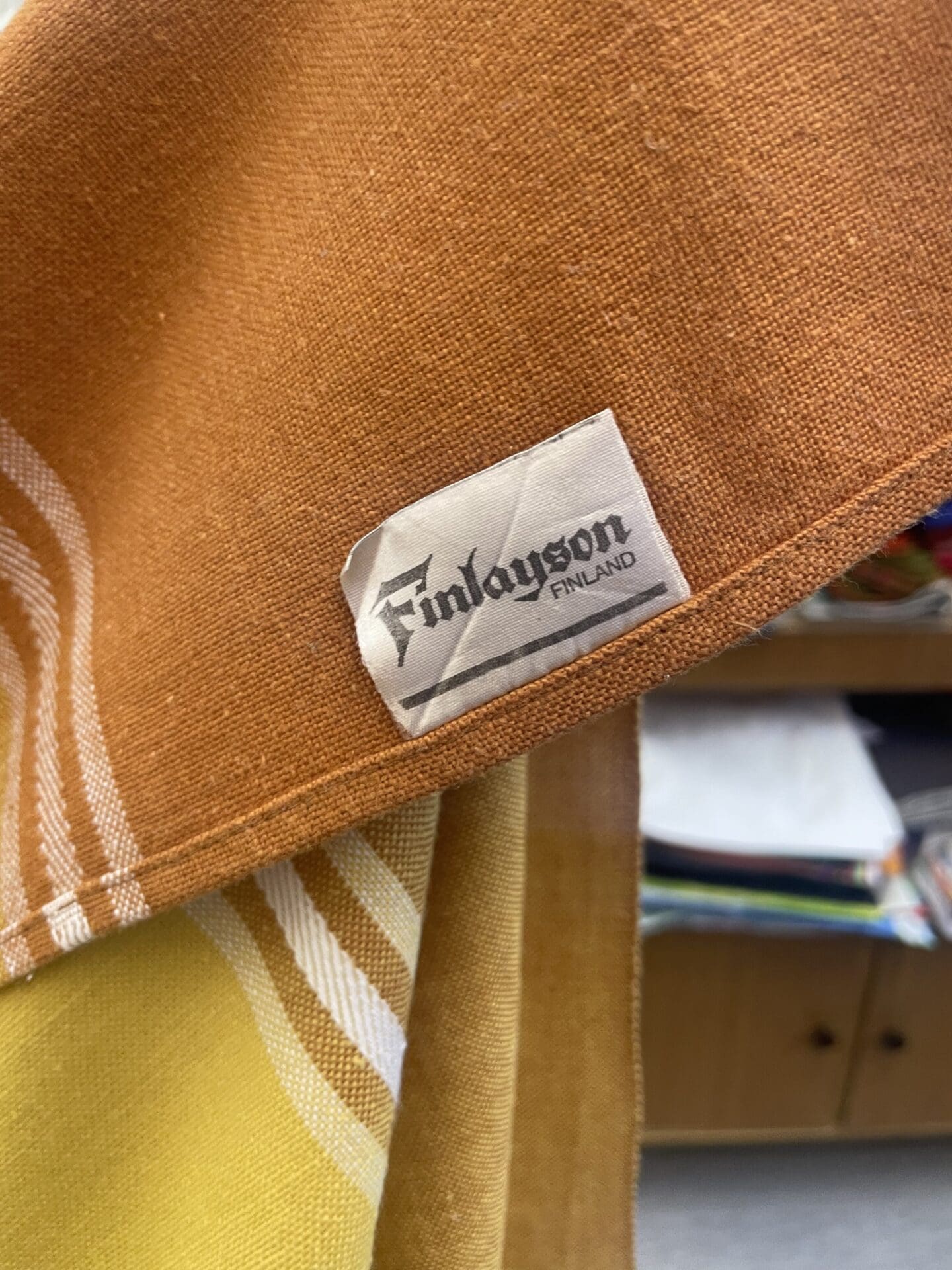 Finlayson Tablecloth Yellow / Brown 135x155cm. Cotton viscose. One error in the pattern.
