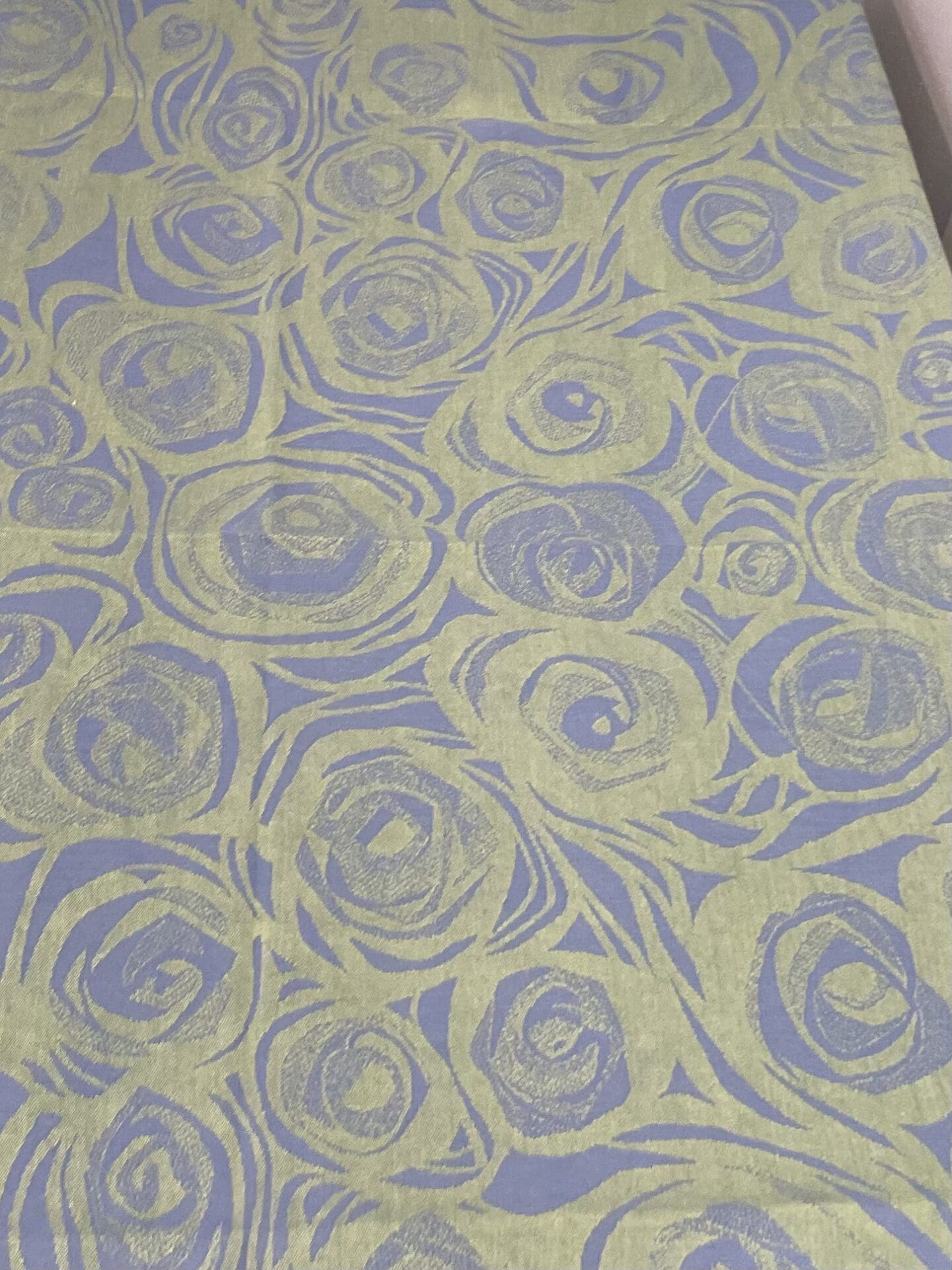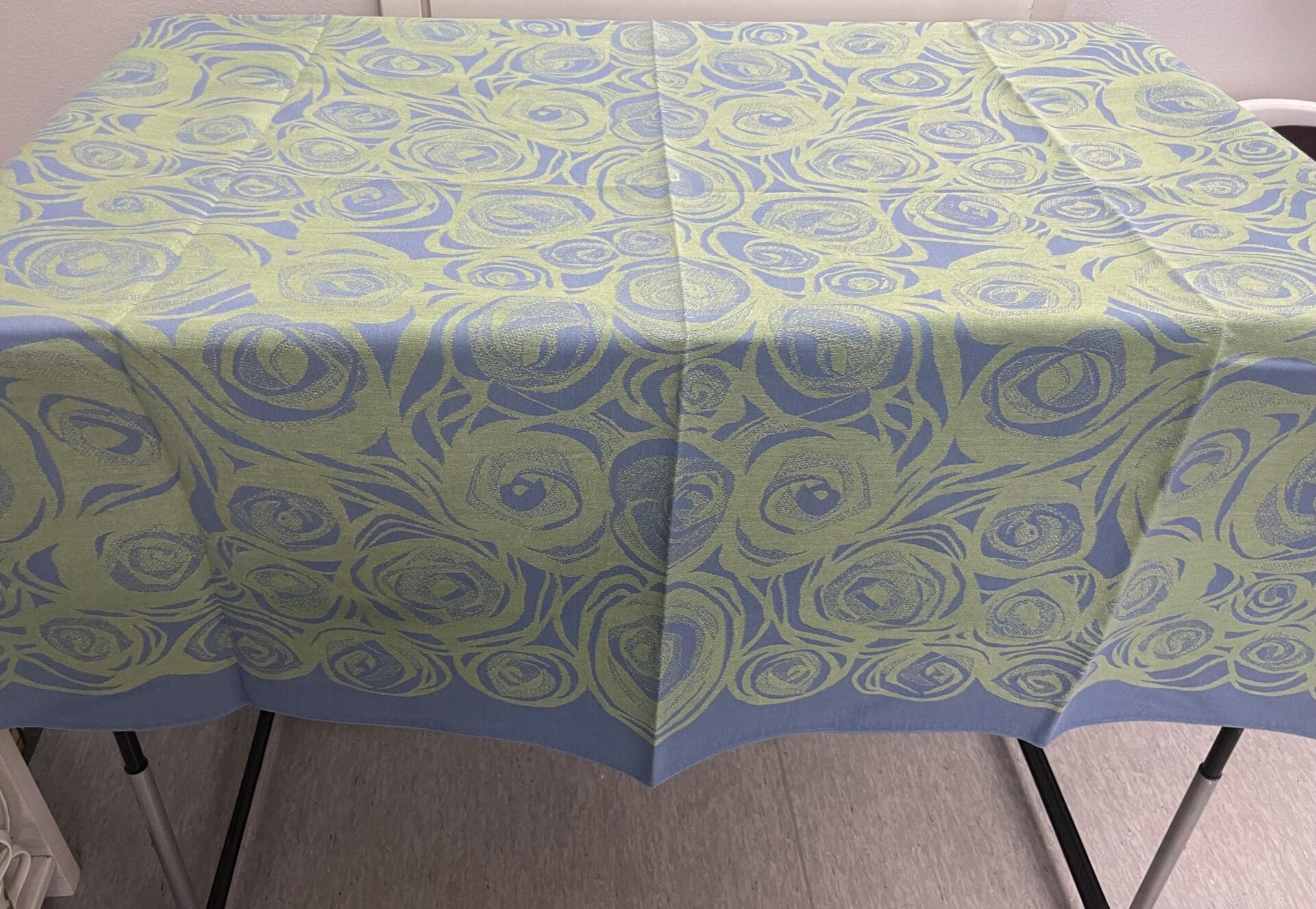Tampella Primavera Tablecloth blue/green 130x122cm Marjatta Metsovaara. Good condition. Half linen. Was in production 1969-74. Tampella modell 494.