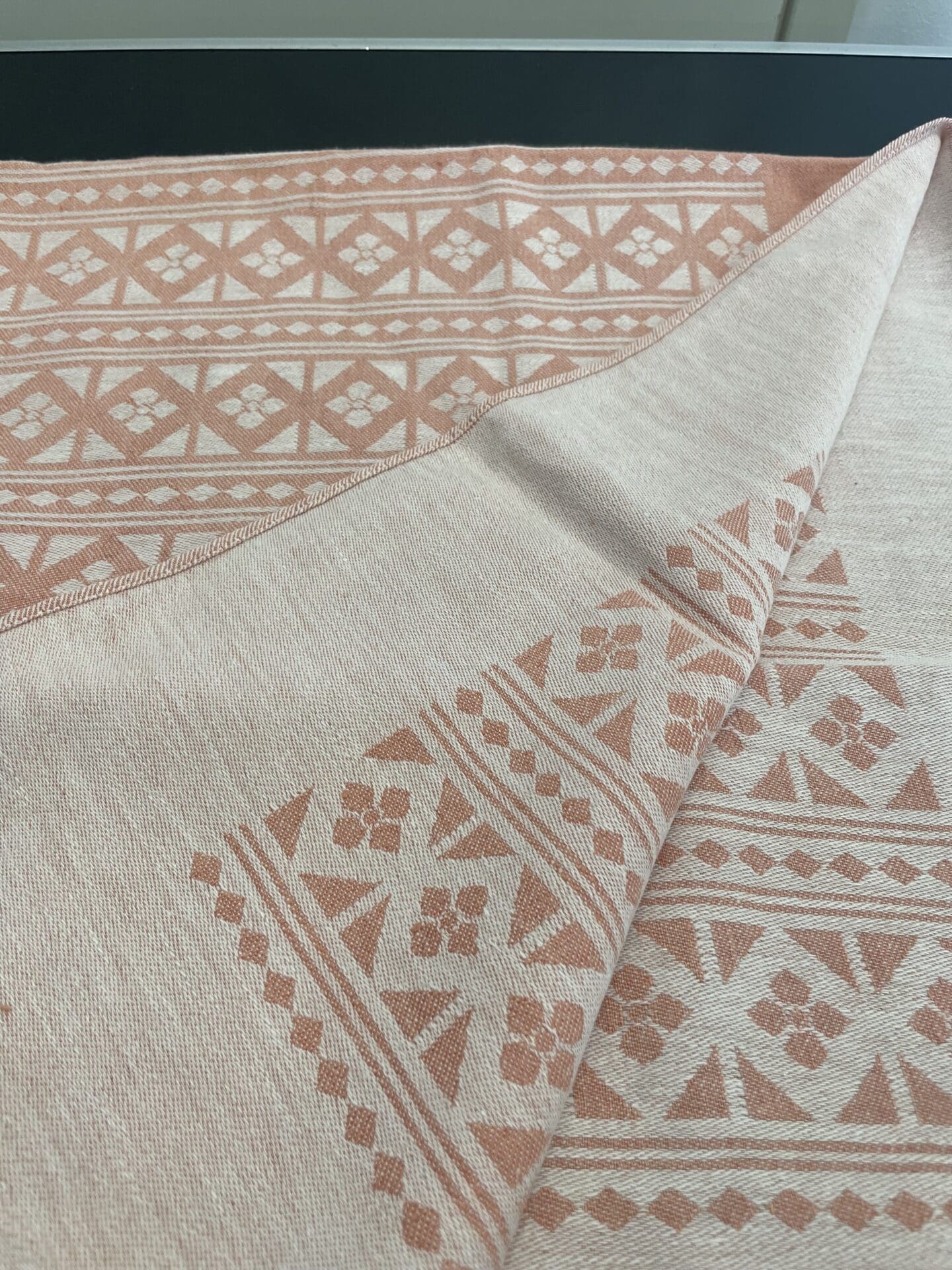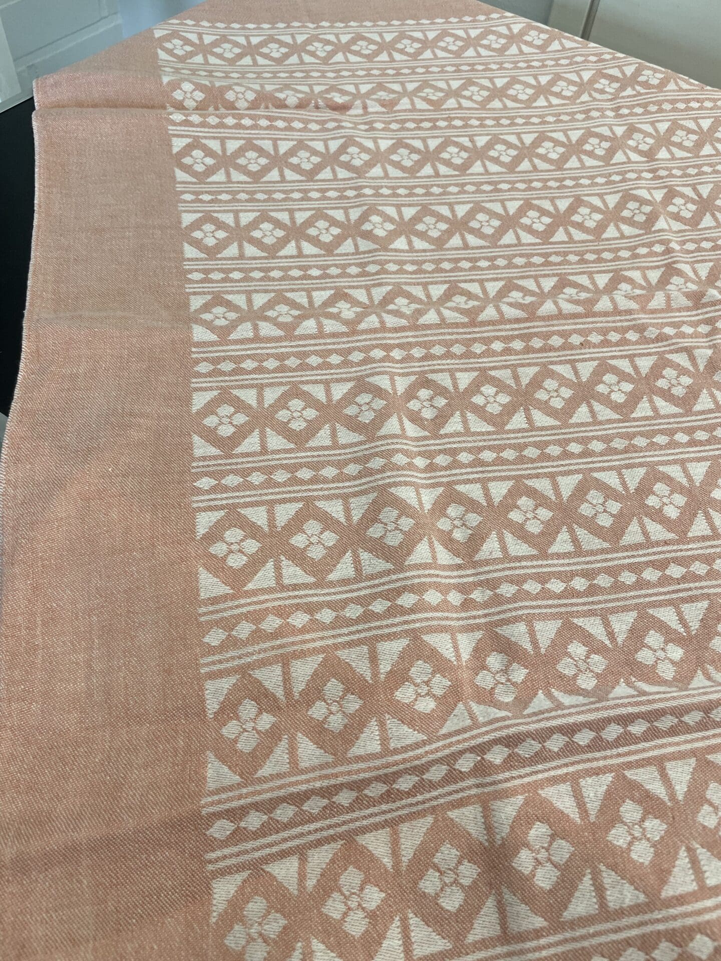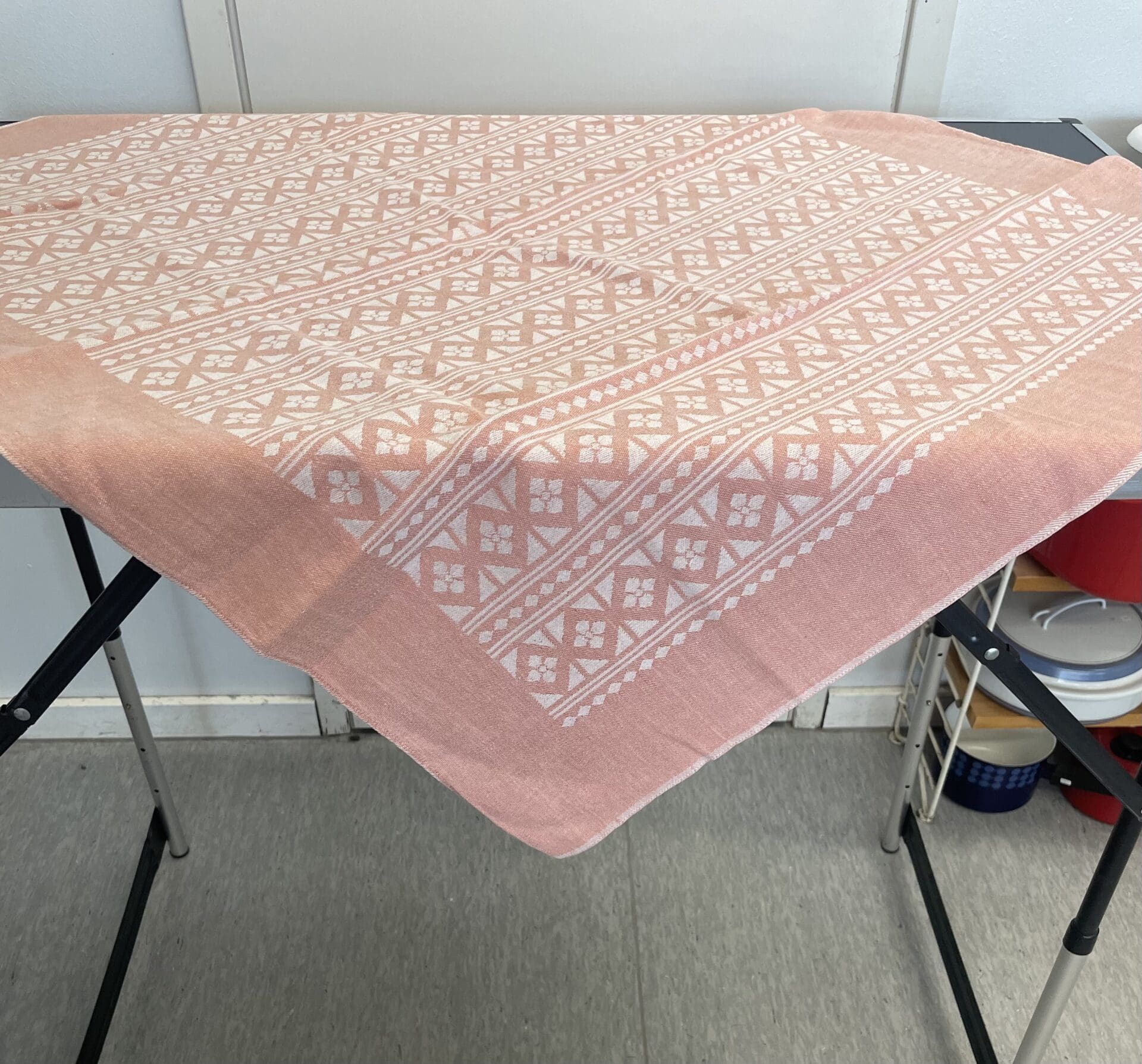 Tampella Tablecloth model 442 pink 84x100cm. Good condition. Half linen. Was in production during 1957-64. The designer is not known.
