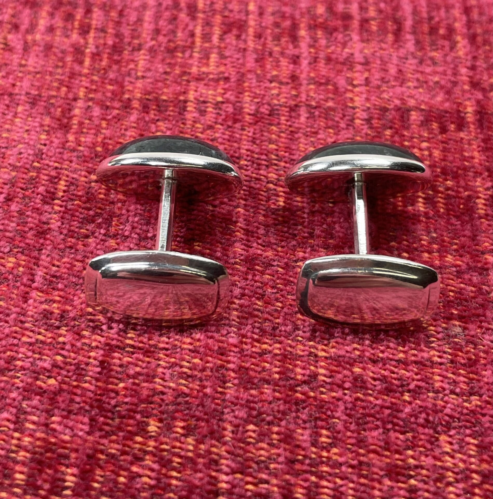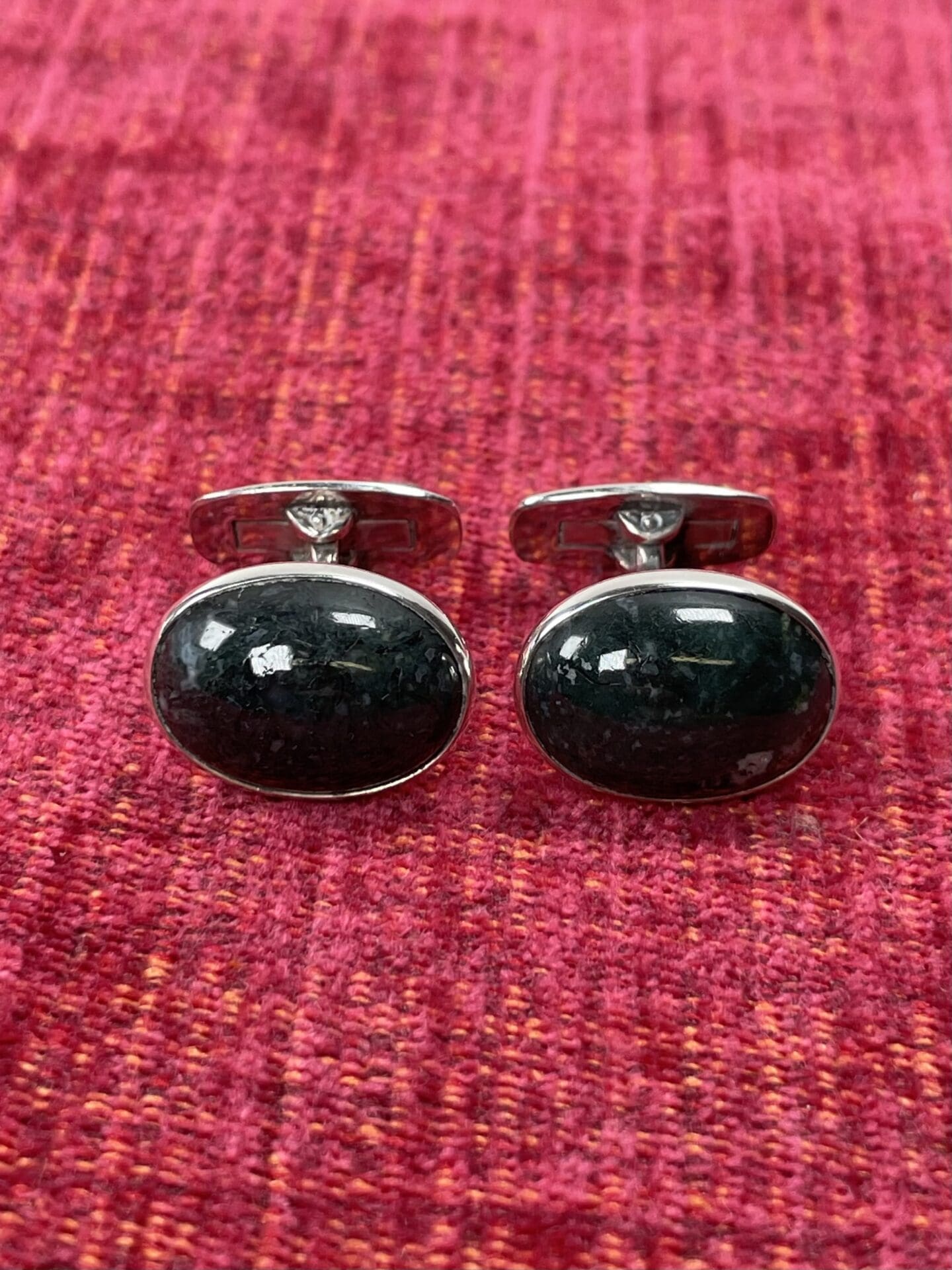 Silver cufflinks with dark green stone.