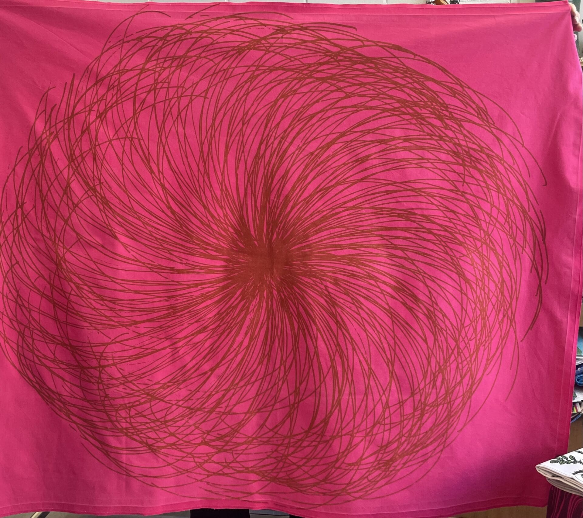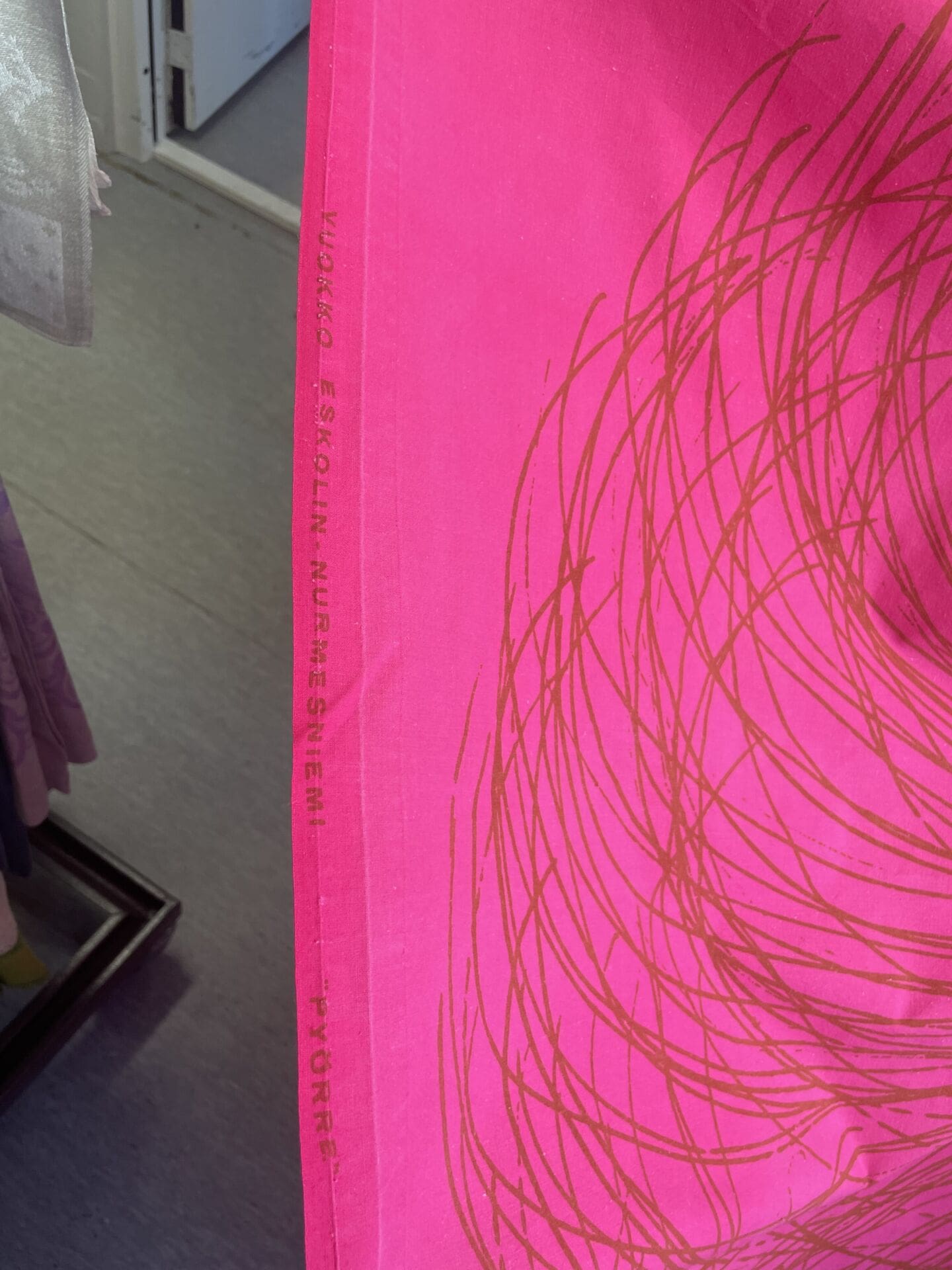 Vuokko Pyörre Fabric 141x118cm Vuokko Nurmesniemi. Used to be a tablecloth. Hem opened. Little faded in color. Cotton.