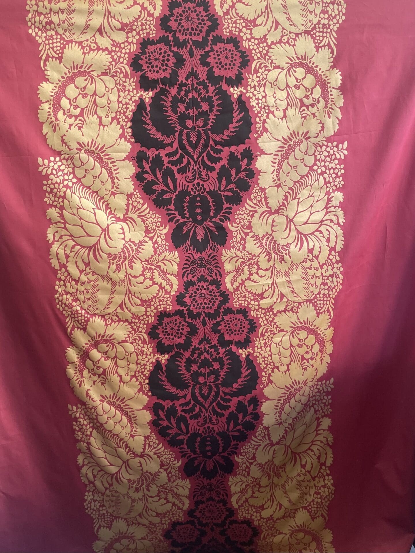 Marimekko Ananas kangas viininpunaista/kultaa/mustaa 148x160cm. Hyvä kunto, ohuehkoa puuvillasatiinia.