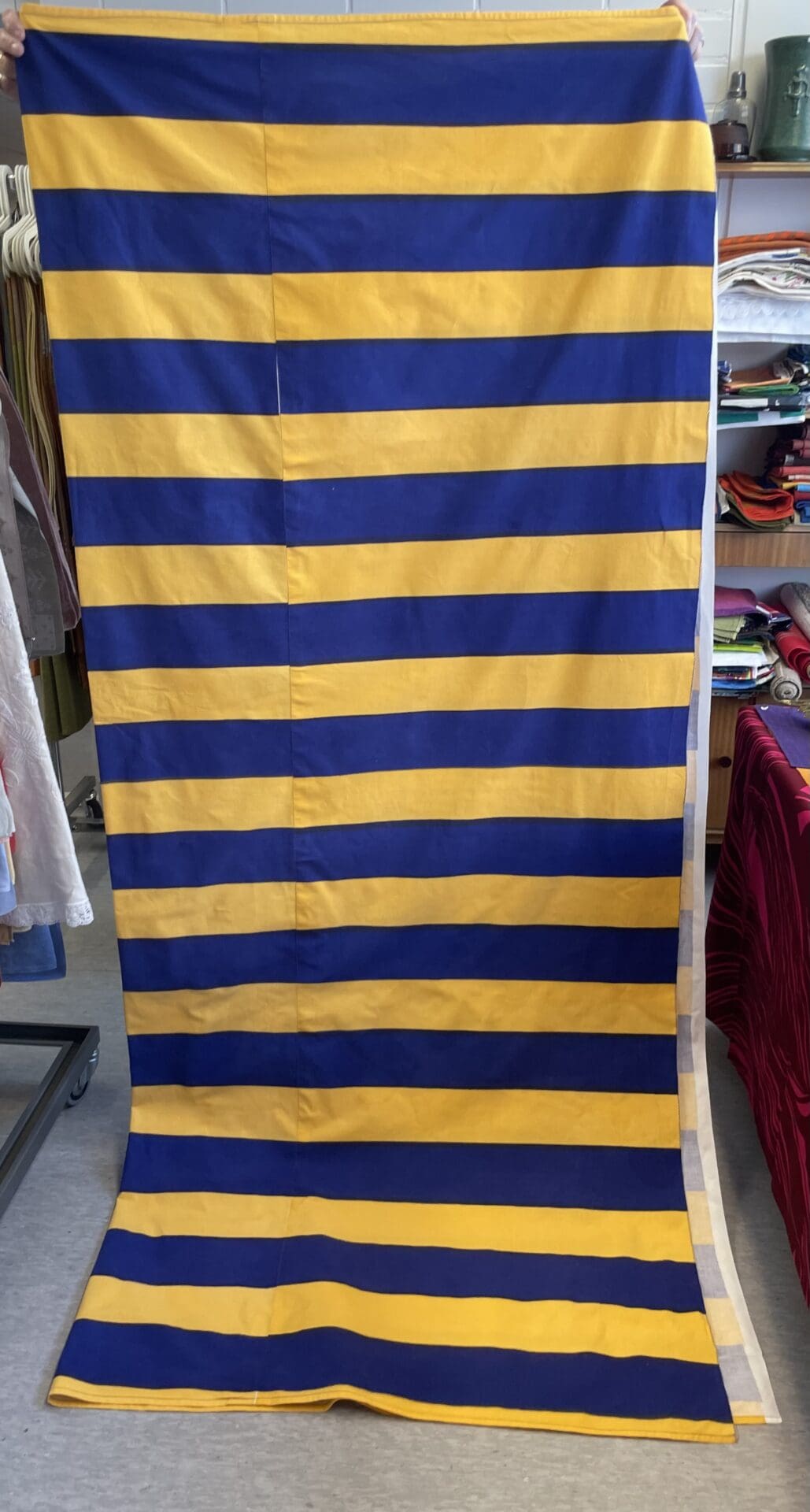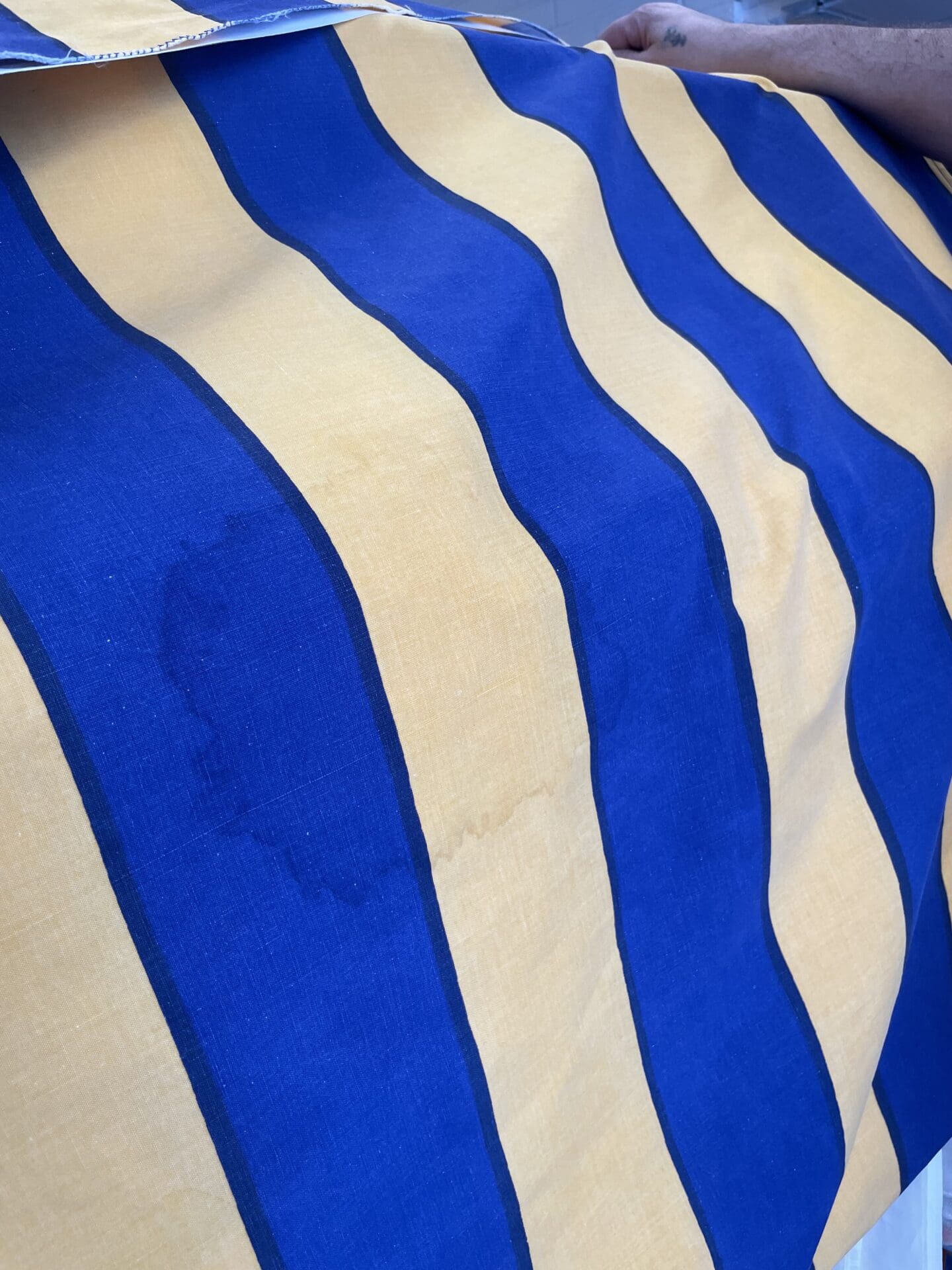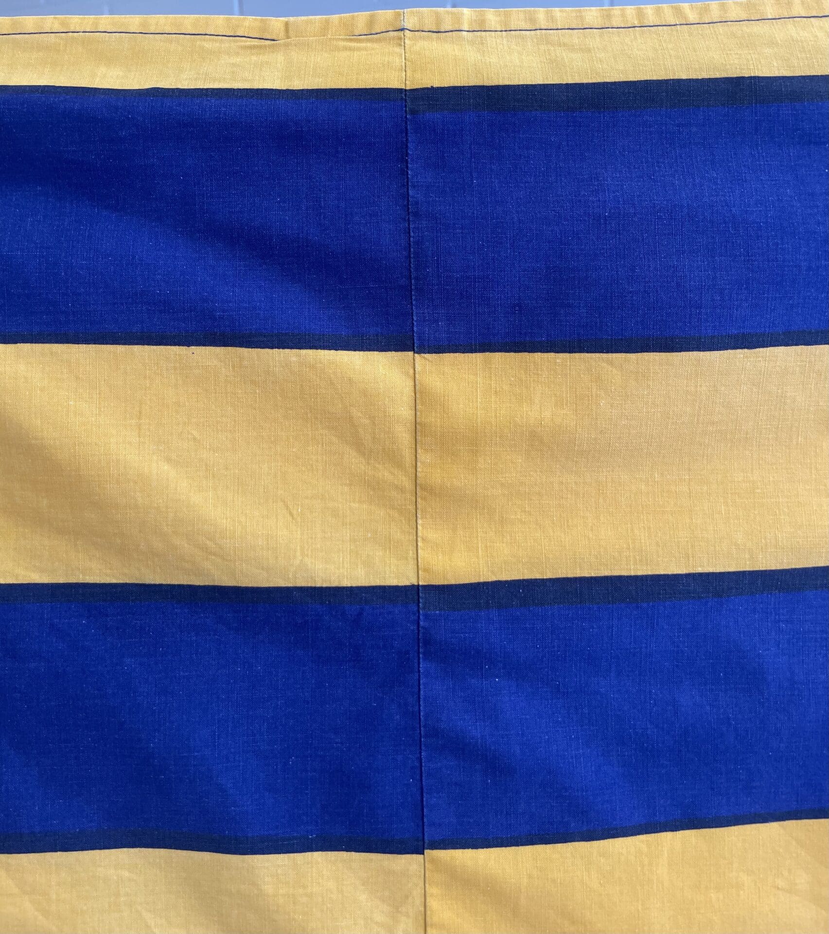 Marimekko kangas Galleria sinikeltainen 195x220cm. Yhdistetty kaksi kangaspalaa. Pesty, mutta jäi laikkuja. Puuvillaa. Ei reunatekstiä. Pääkuvan värit vastaavat eniten todellisuutta.