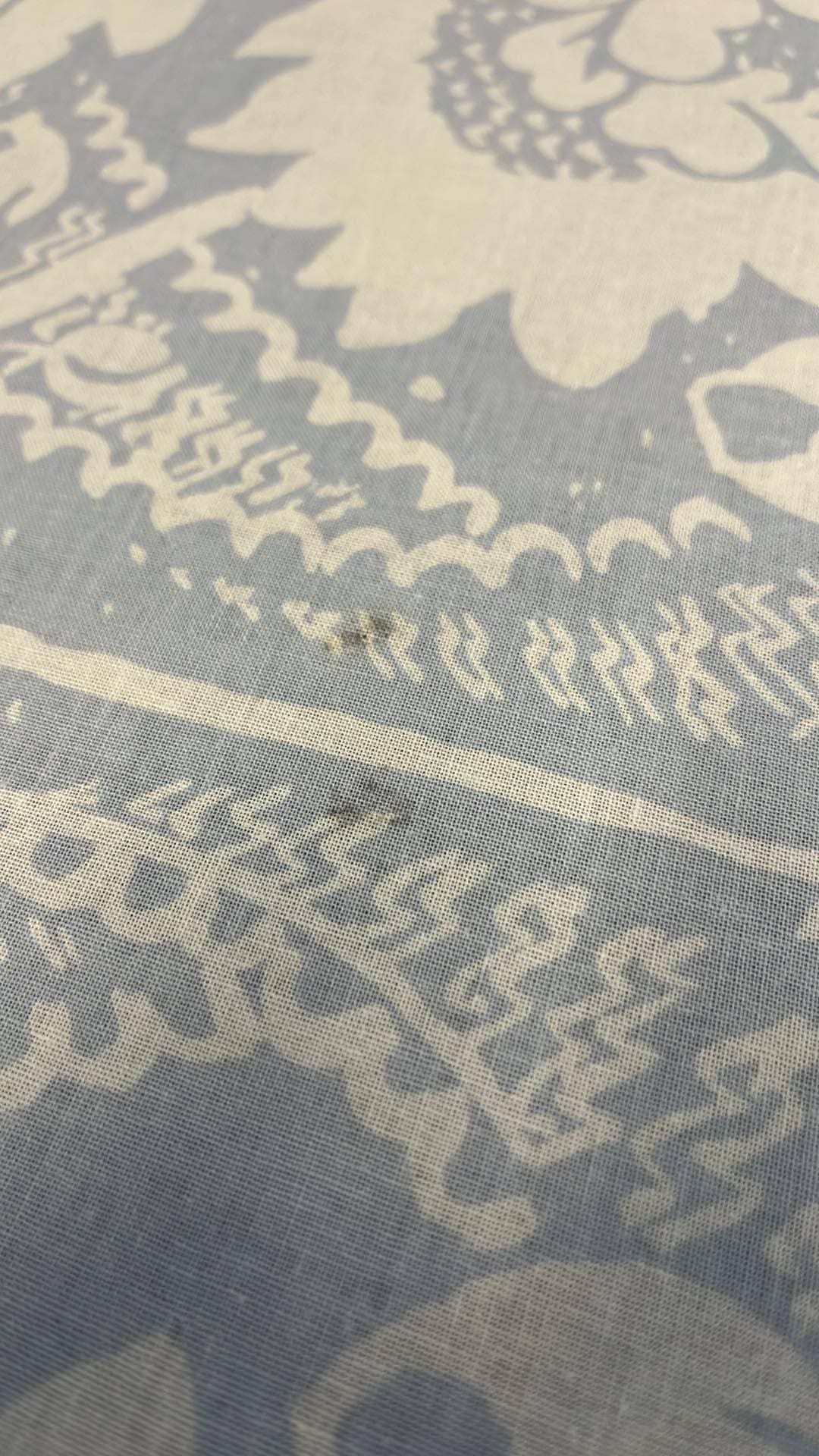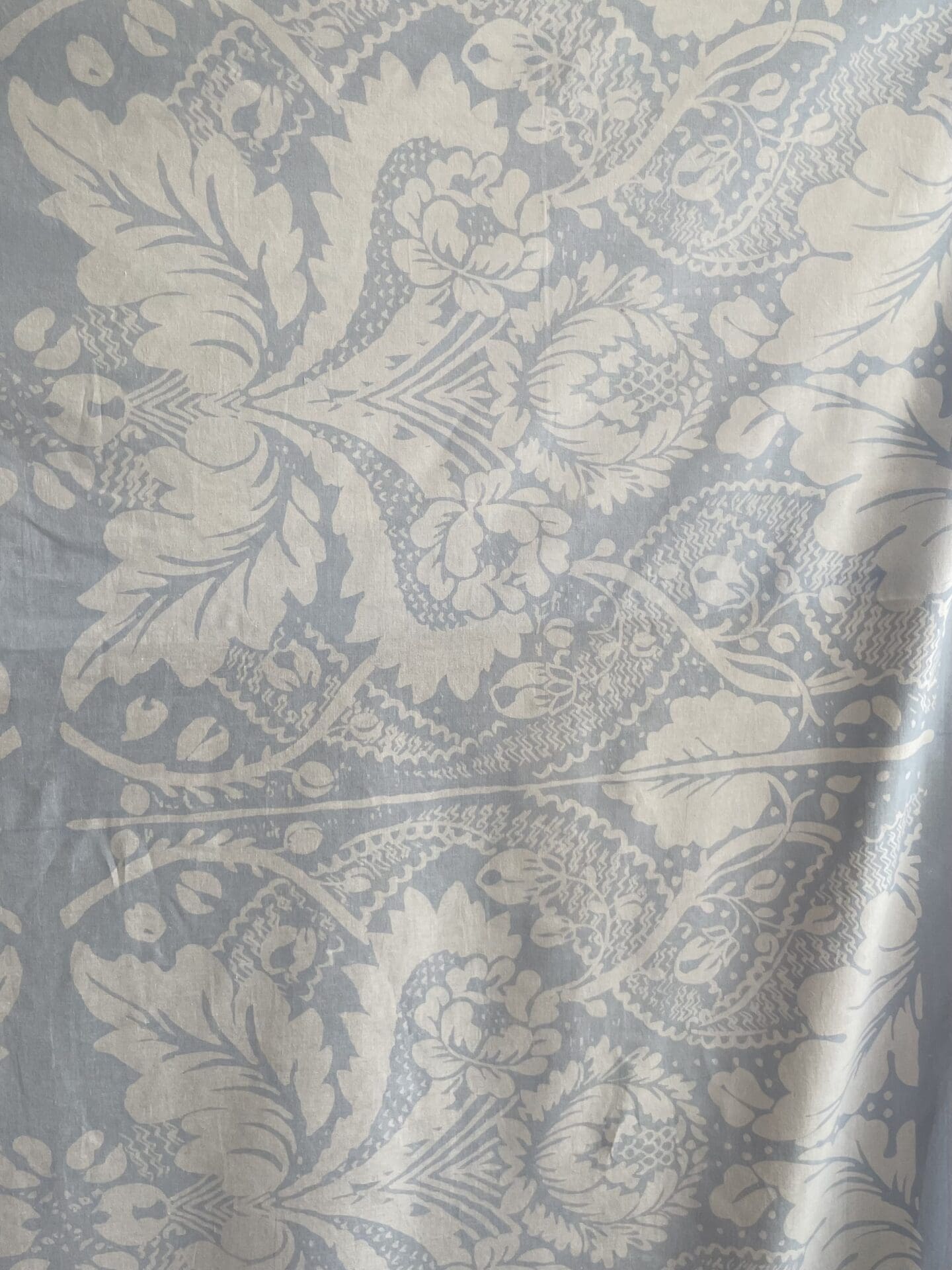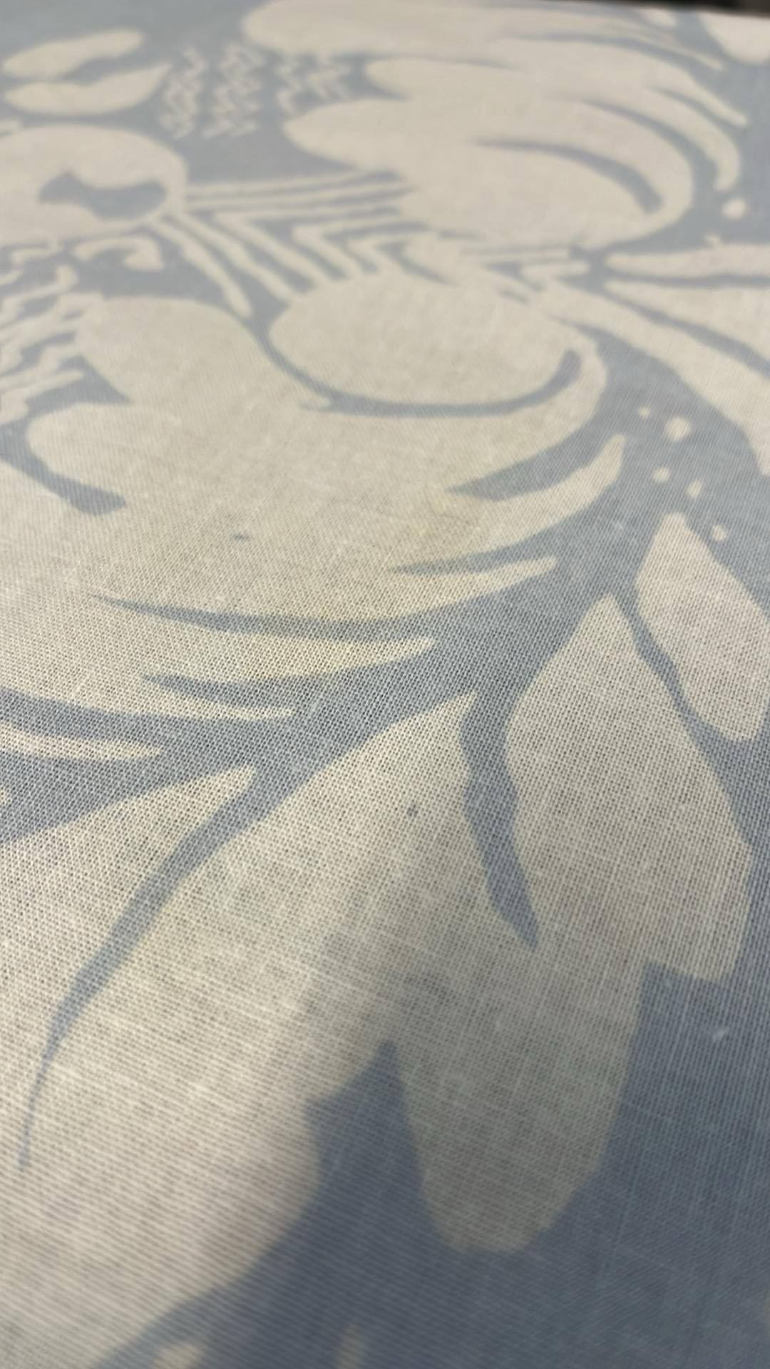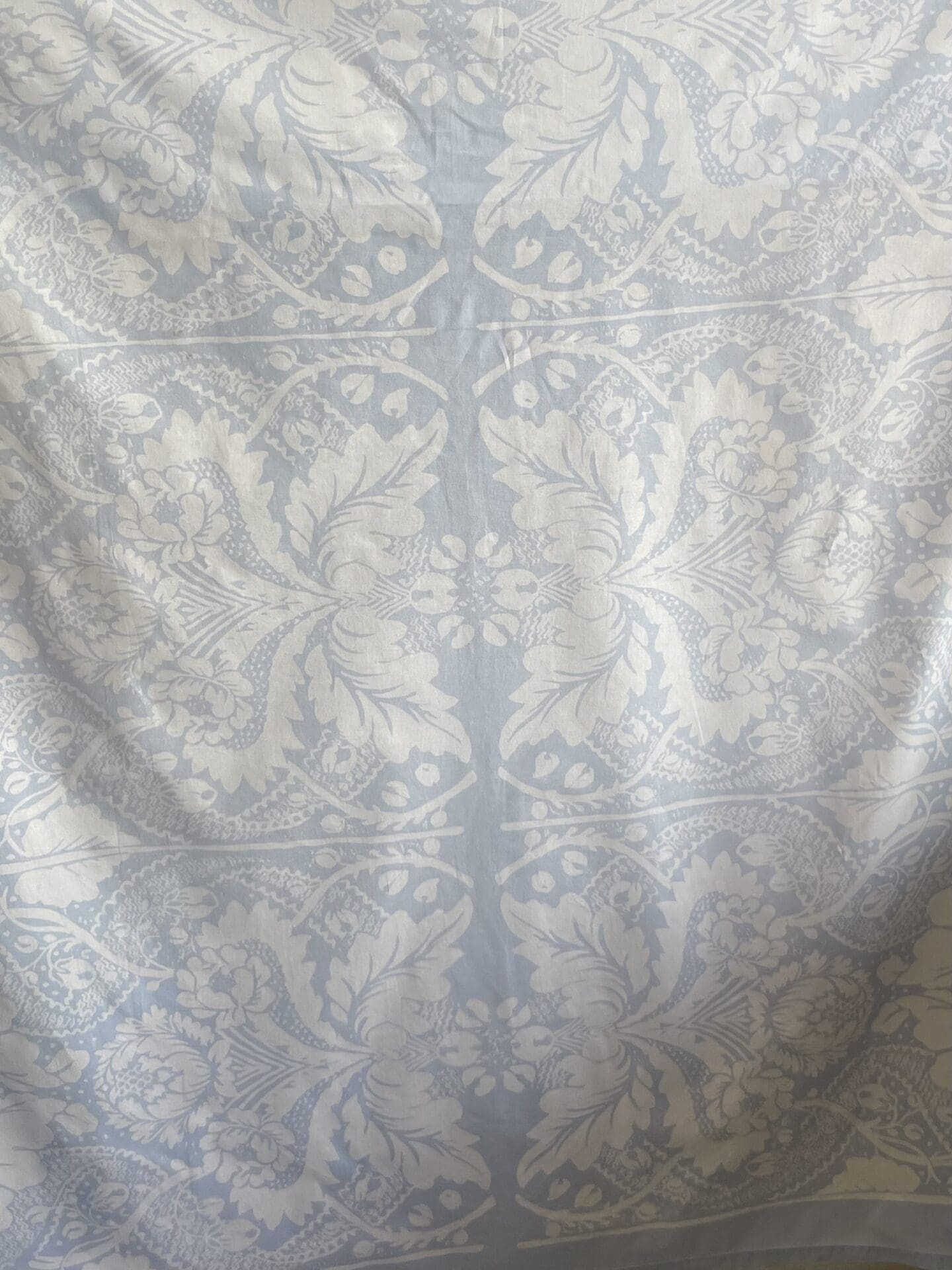 Marimekko vaaleansininen Fandango pöytäliina 140x227cm. Maija Isolan suunnittelema kuosi. Pari haaleaa tahraa. Puuvillaa.