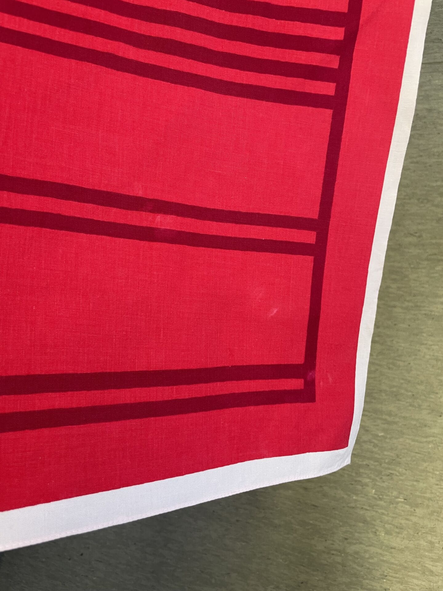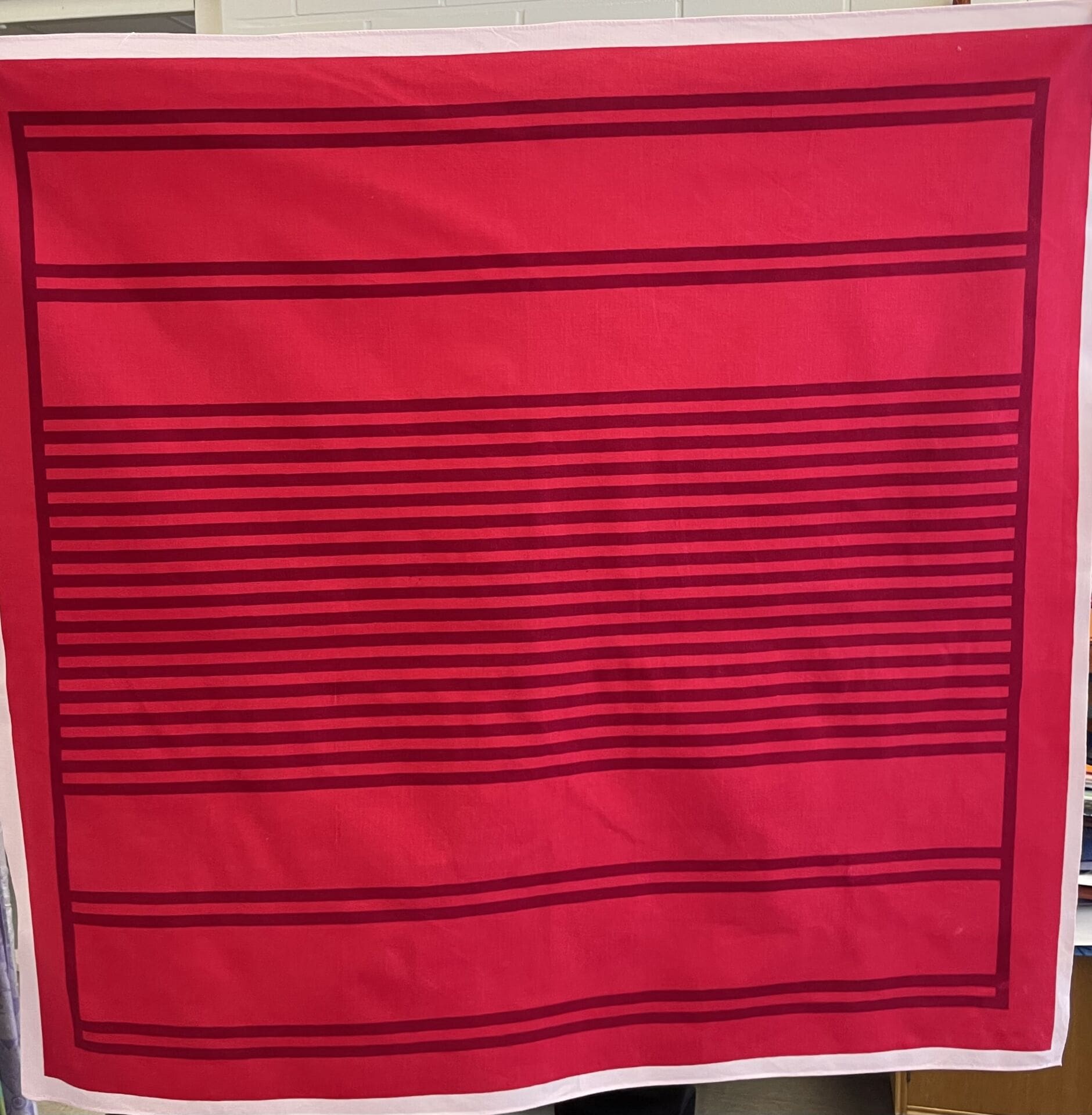 Punainen pöytäliina 87x84cm. Vähän kulumaa. Puuvillaa.