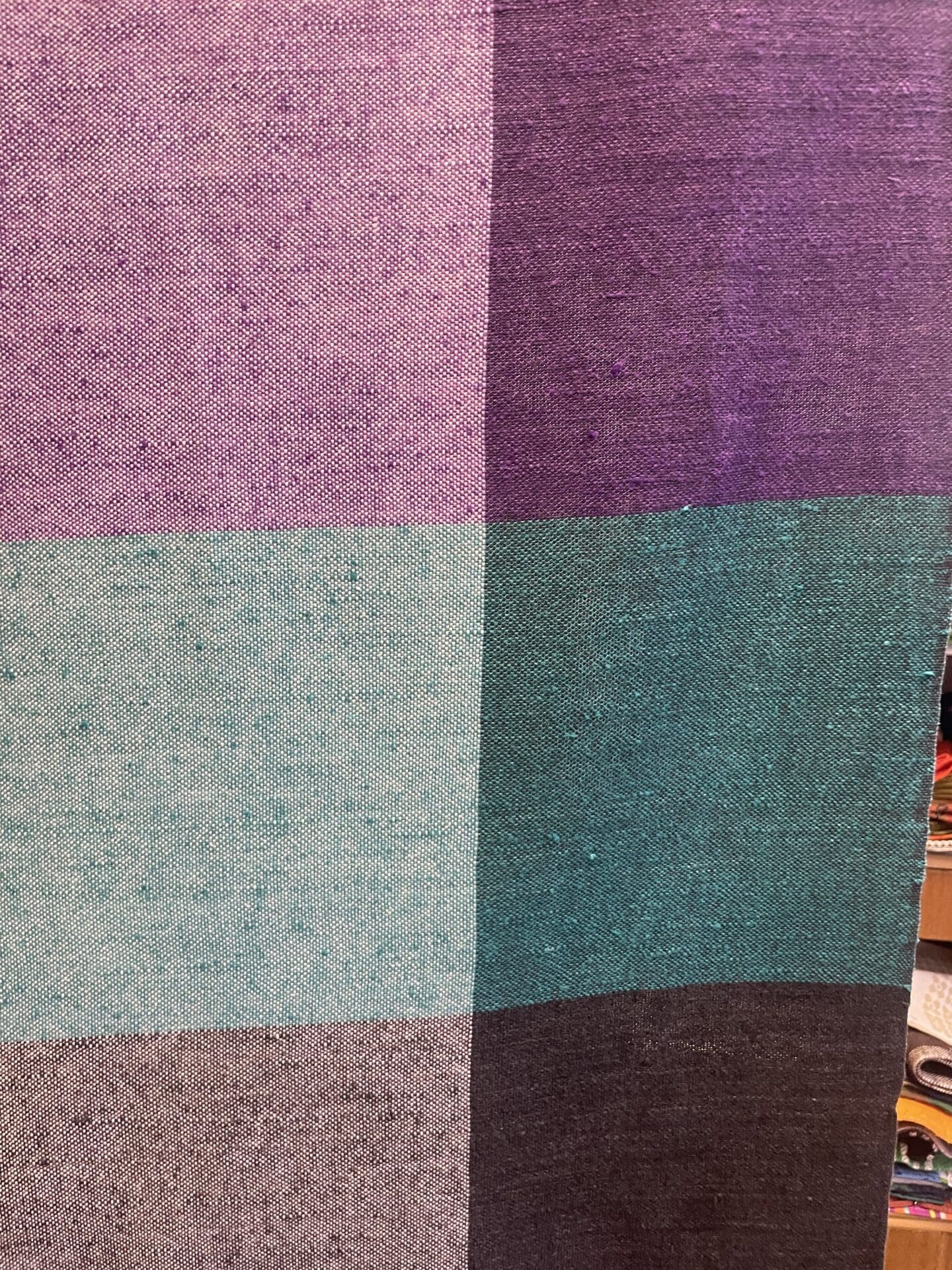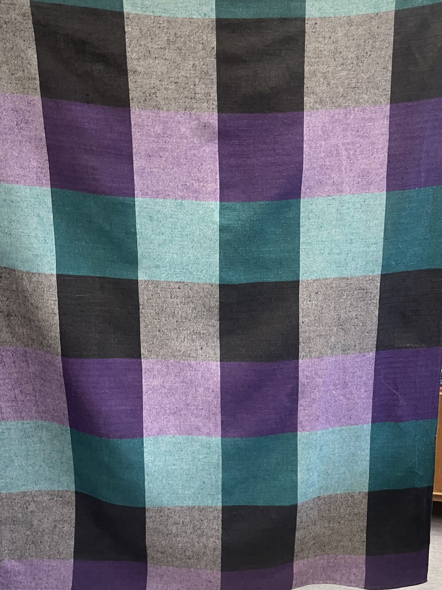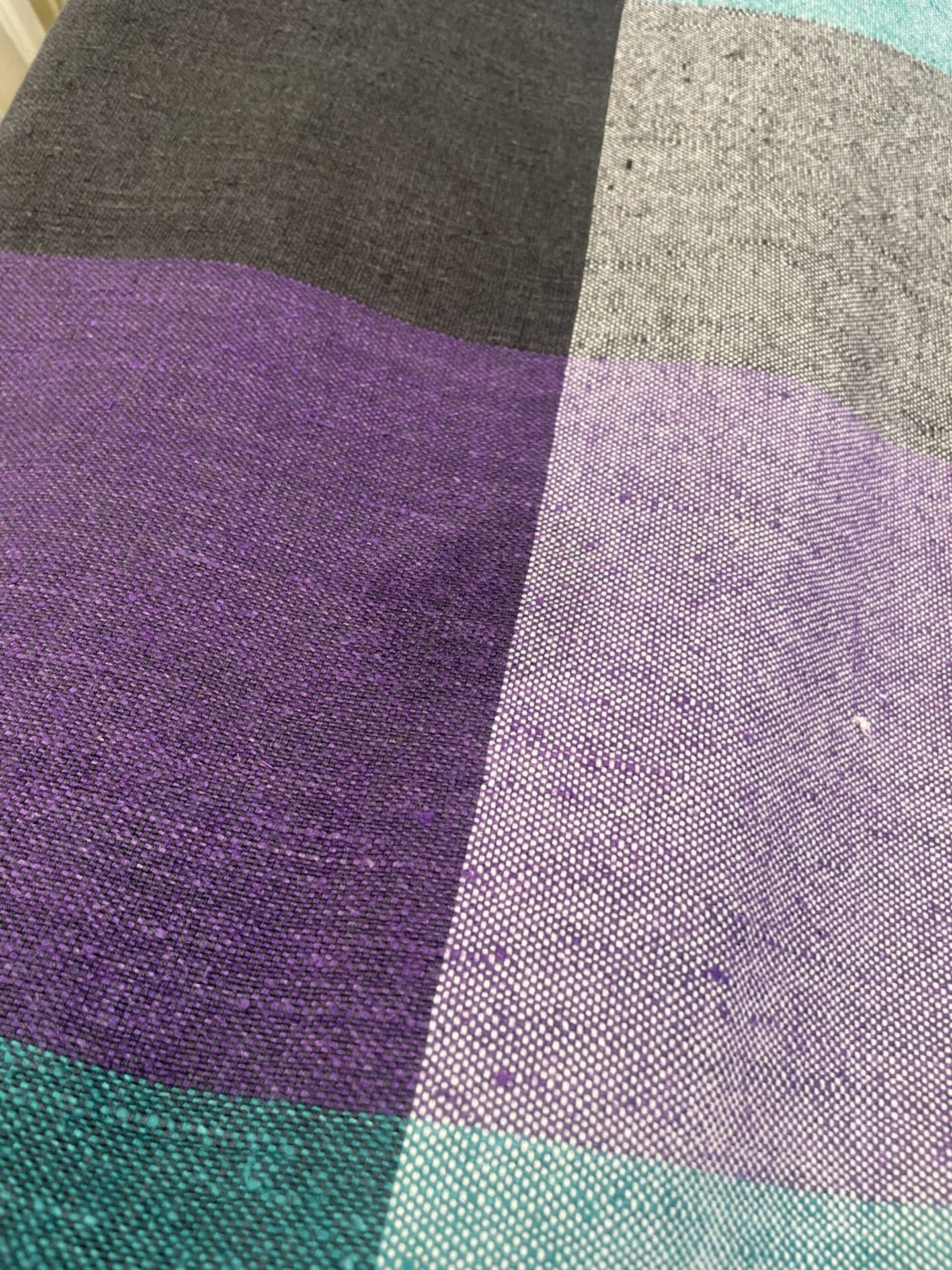 Ruudullinen pöytäliina pellavaa 119x167cm. Yksi tahra.