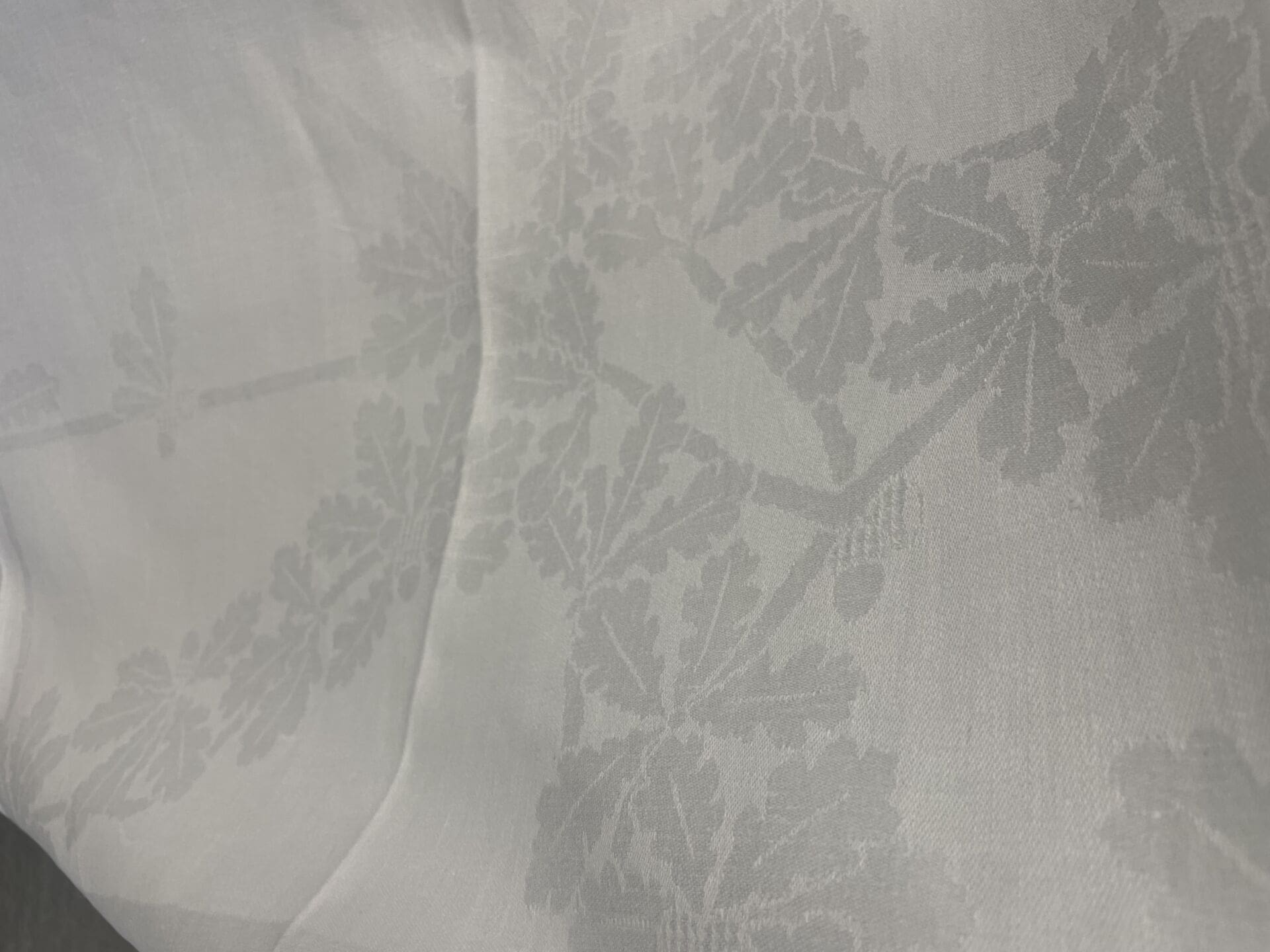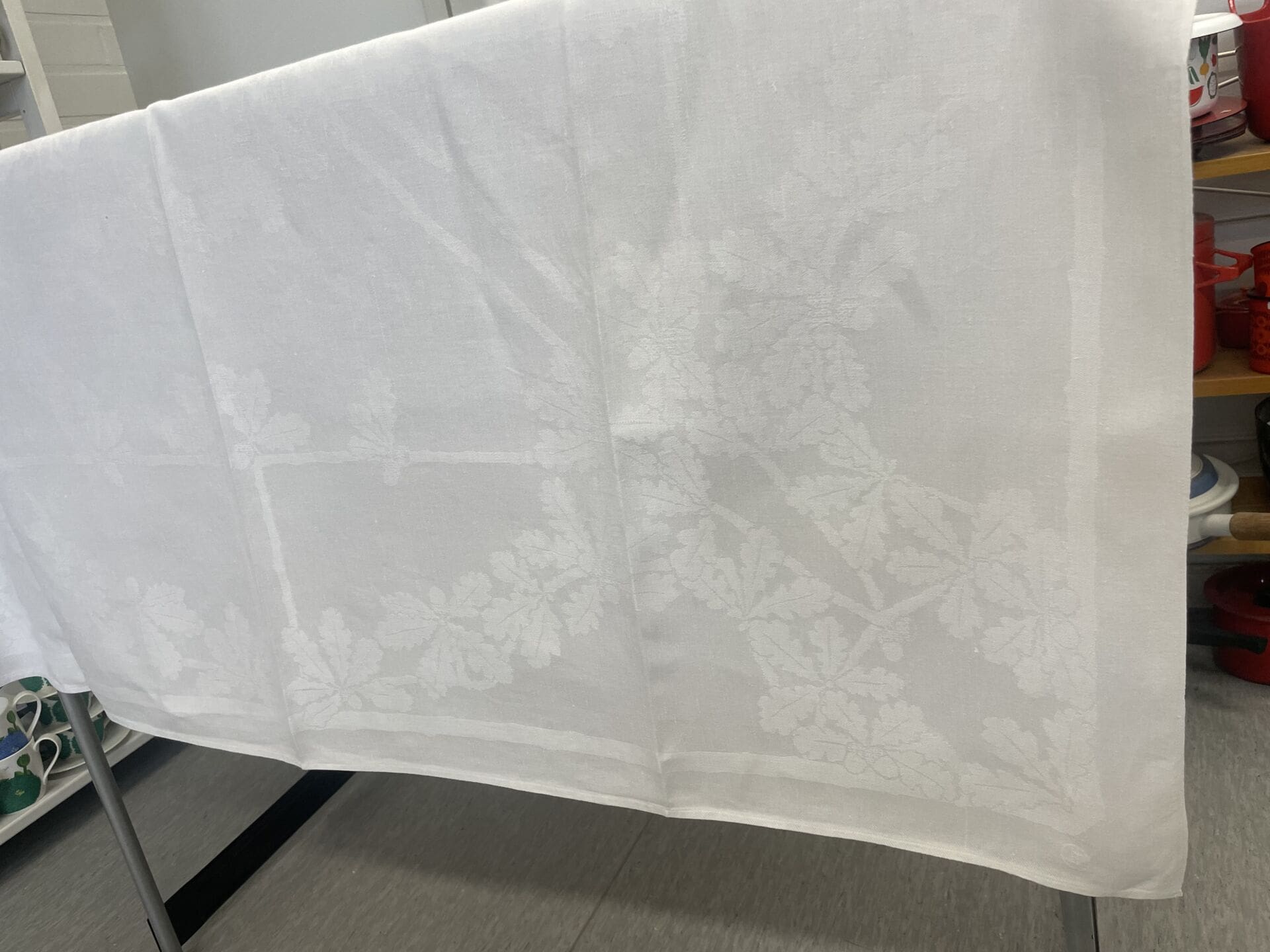 Tampella damasti pöytäliina Tammenlehvä 130x135cm valkoinen. Hyvä kunto, pellavaa. Suunnittelija Aili Rancken. Oli tuotannossa vuosina 1932-76.
