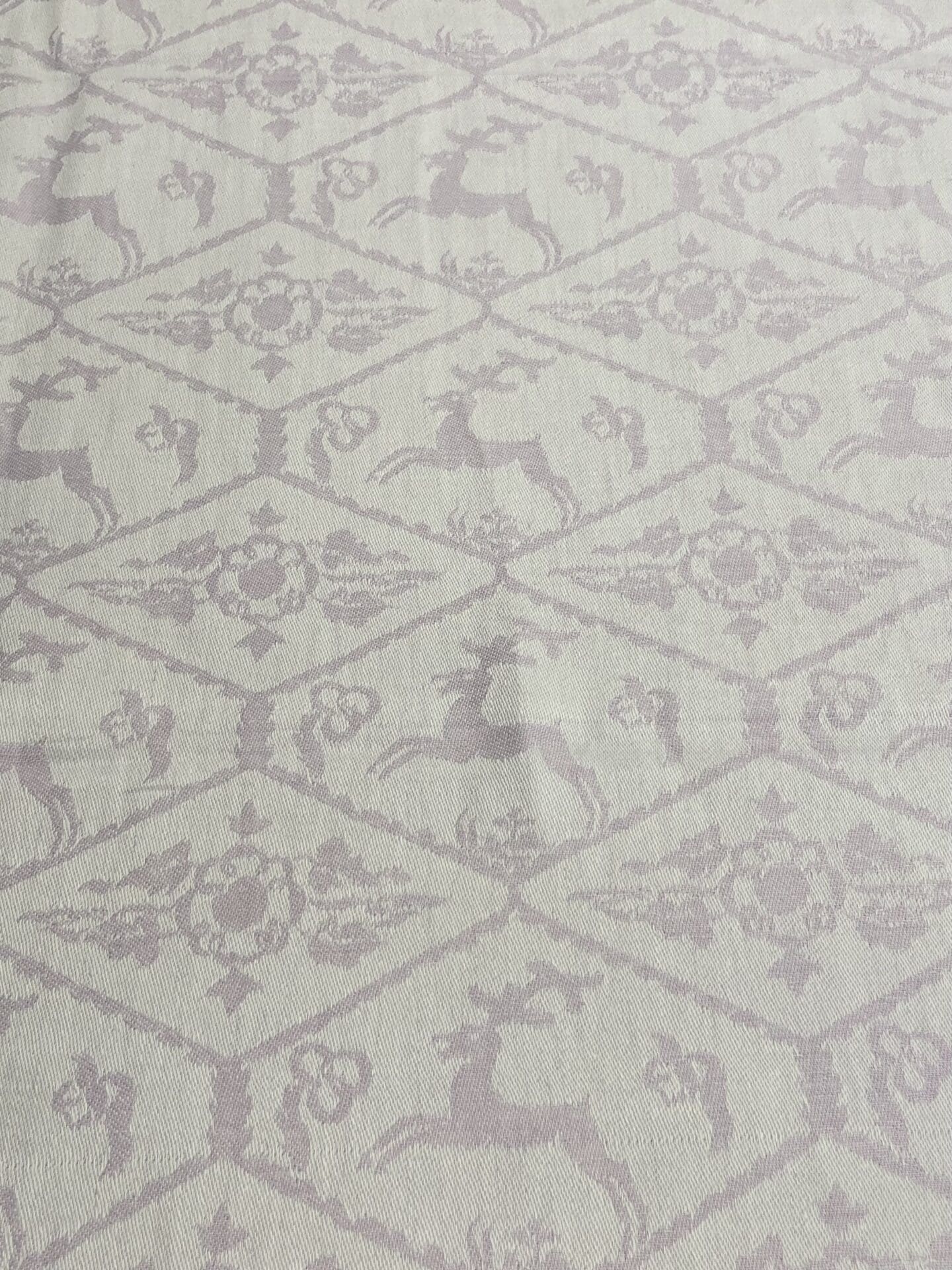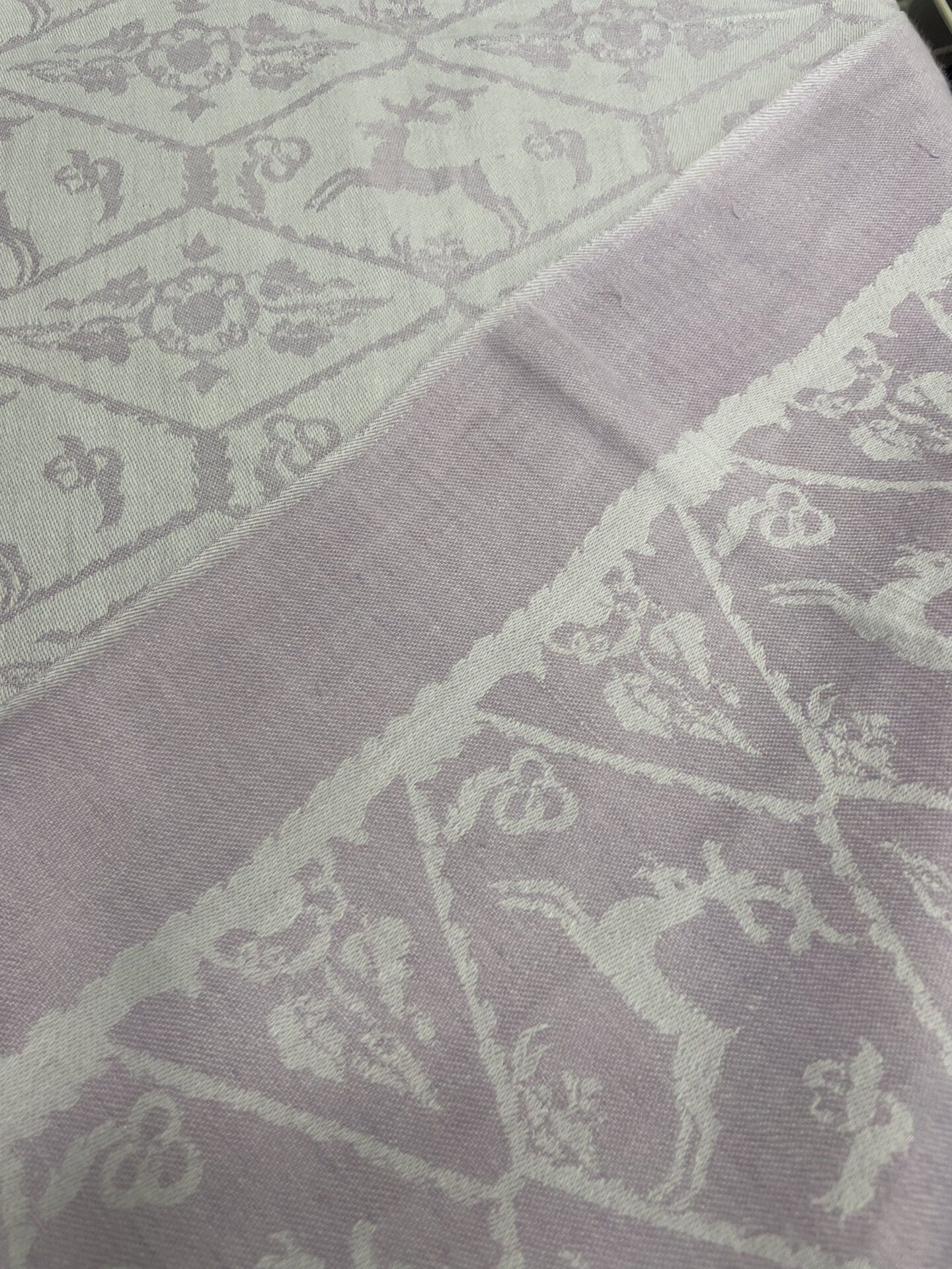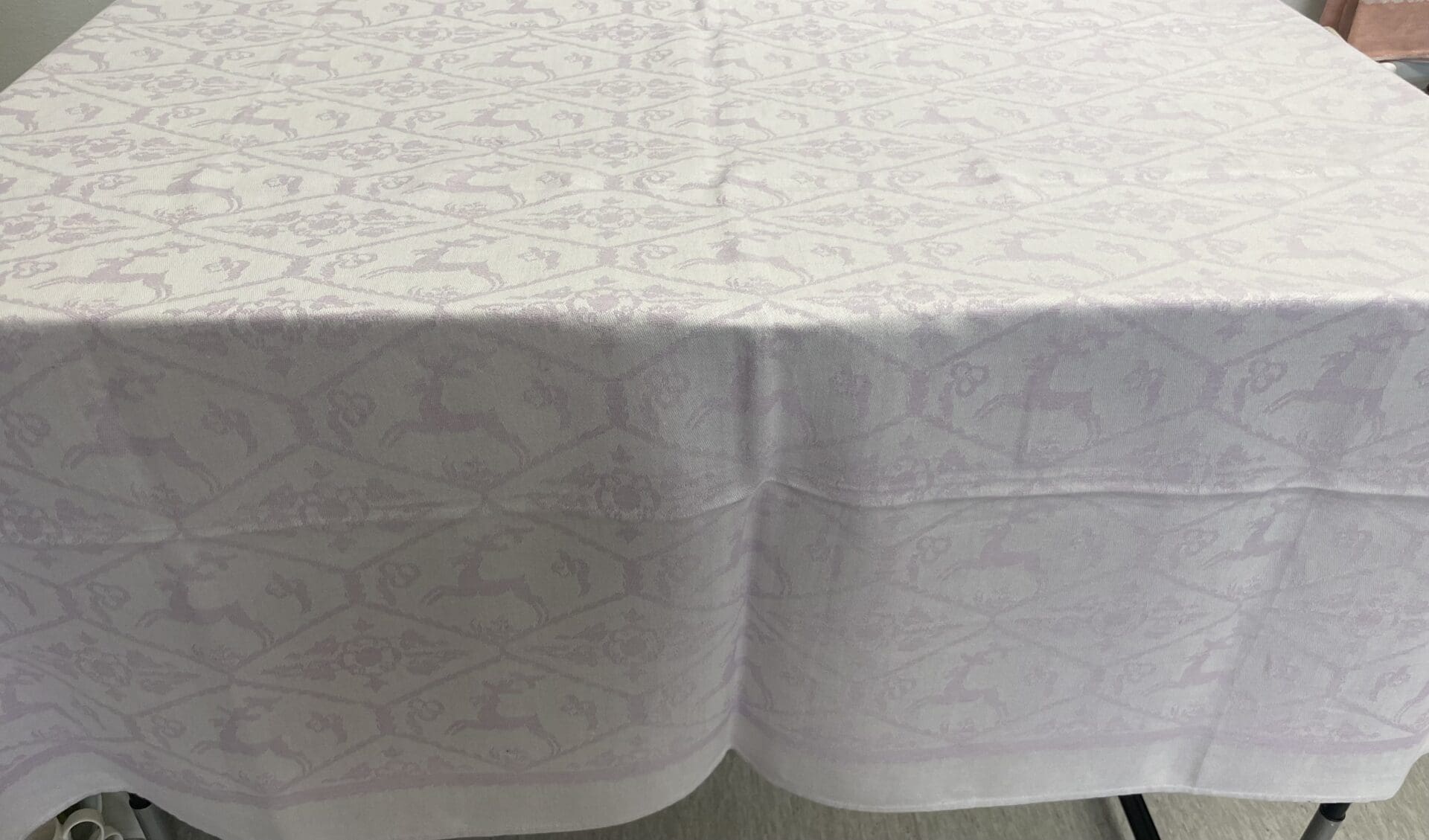 Tampella pöytäliina Kauris 128x122cm vaalea lila.Materiaali puolipellavaa. Hyvä kunto. Valmistuksessa 1932-1963