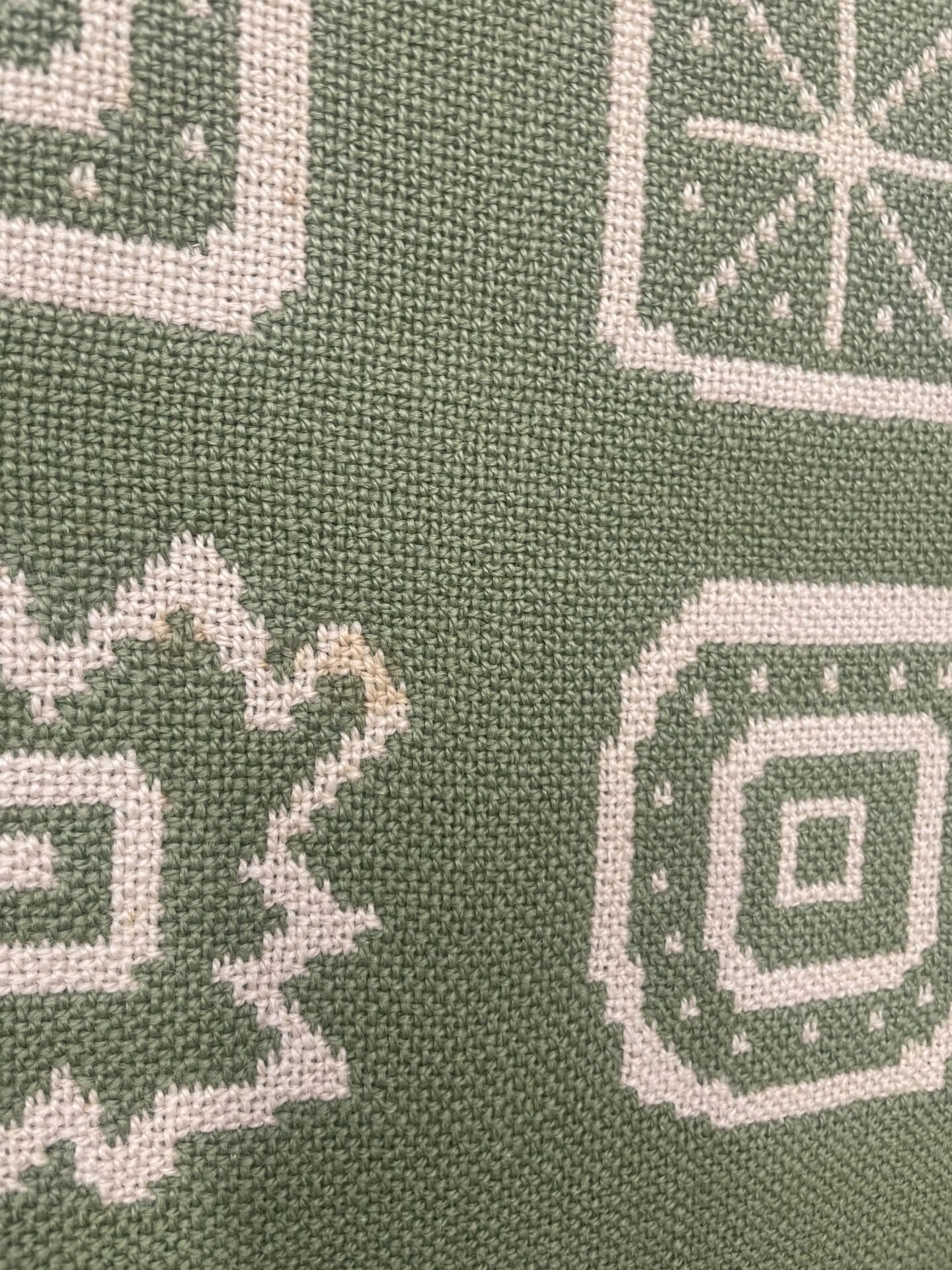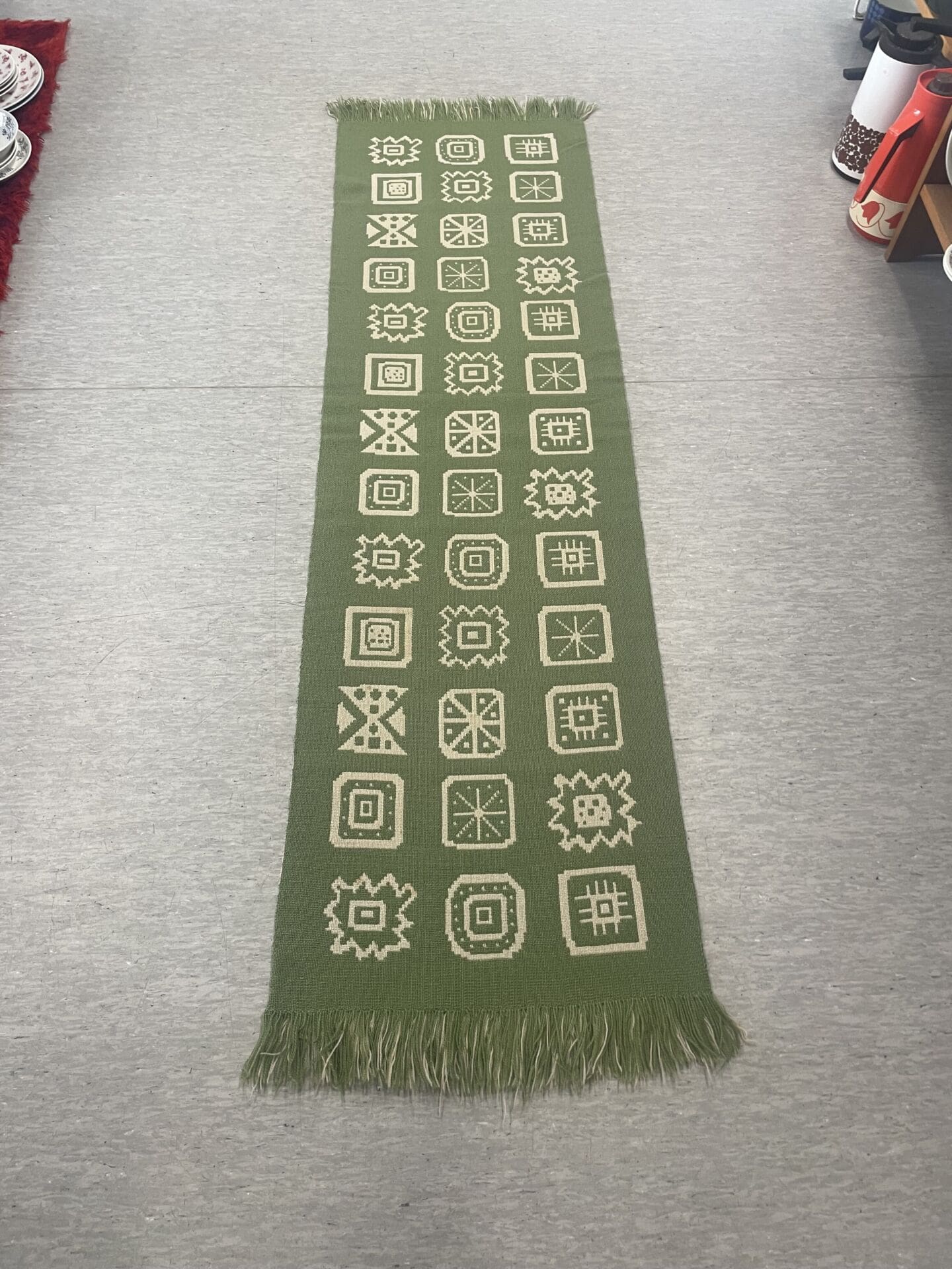 Vihreä villa täkänä 48x165cm. Vuorelman malli. Muutama haalea tahra.
