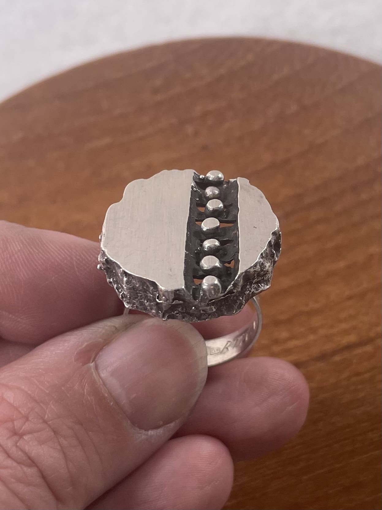 Vintage hopeasormus 18mm Auran kultasepät 1967. Hyvä kunto, vähän patinaa. Halkaisija 23mm. Kaiverrus 24.12.1970 Ritva. Leima O7=1967.